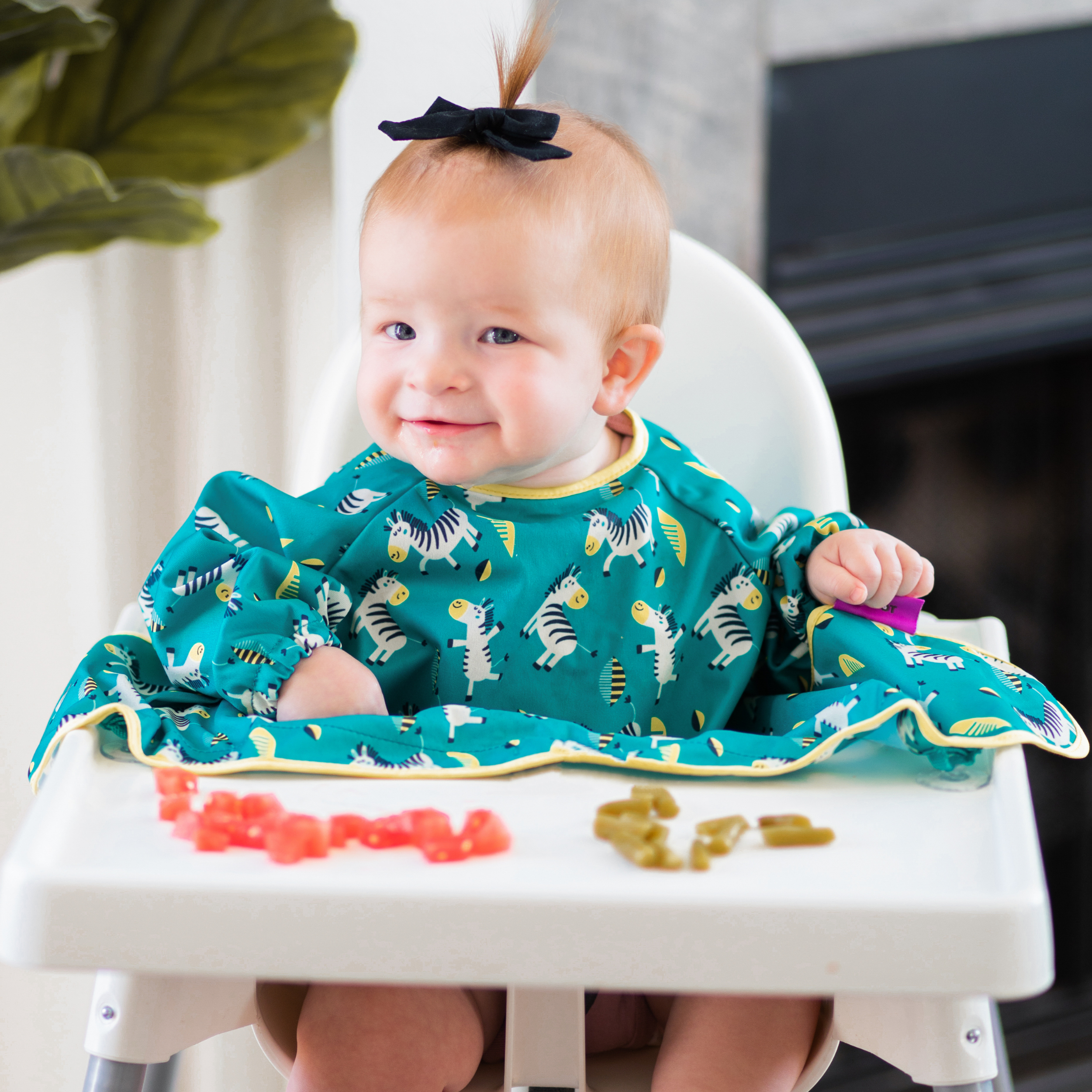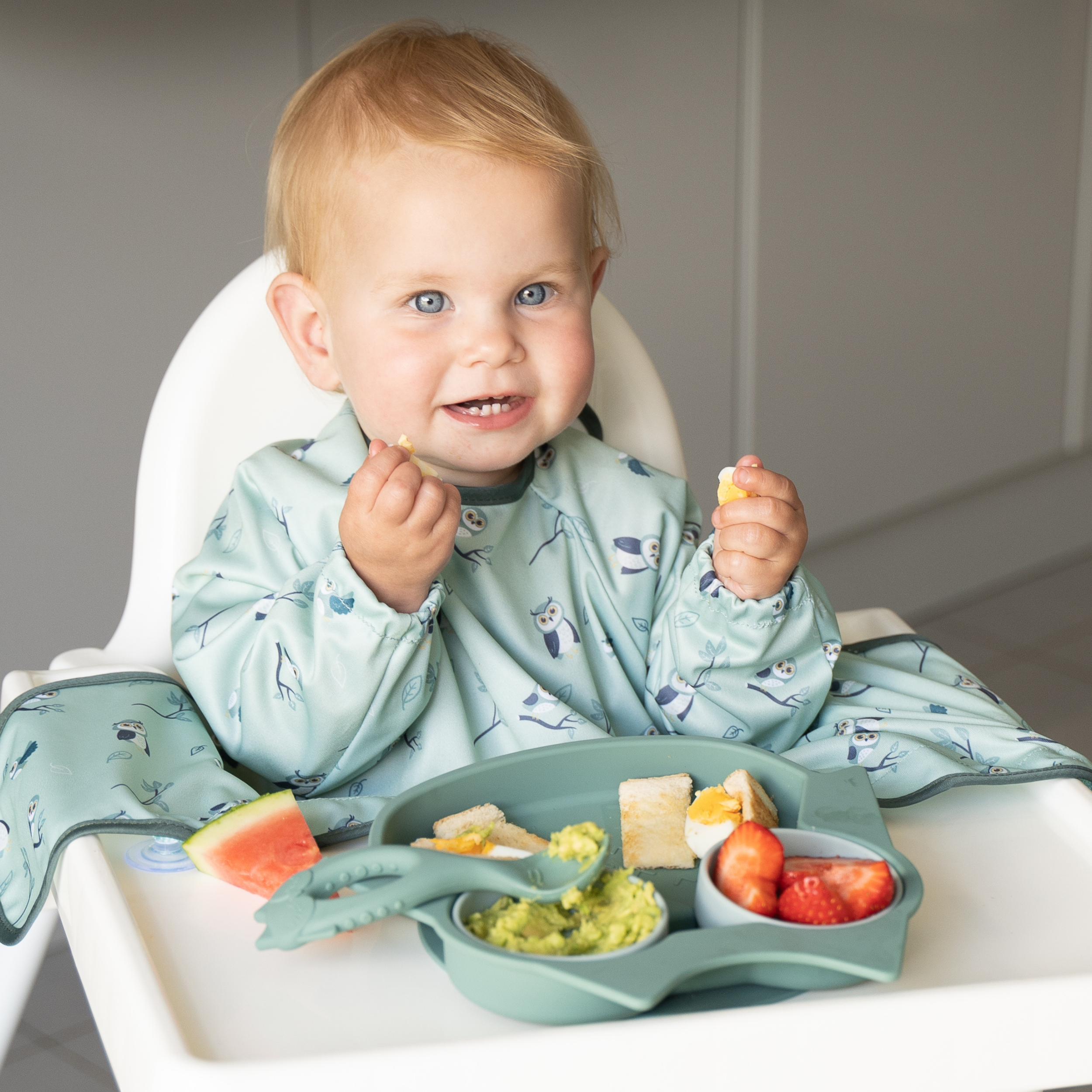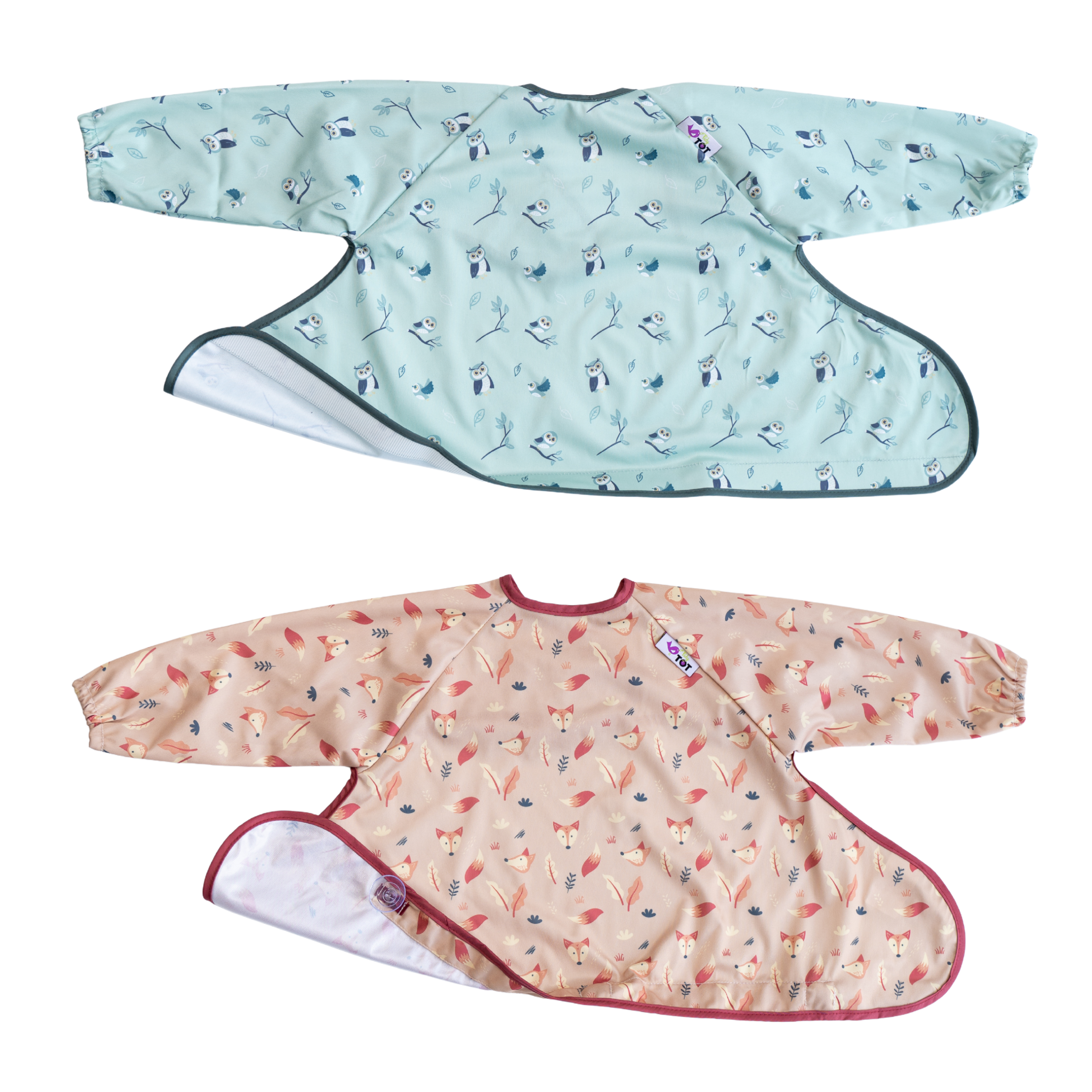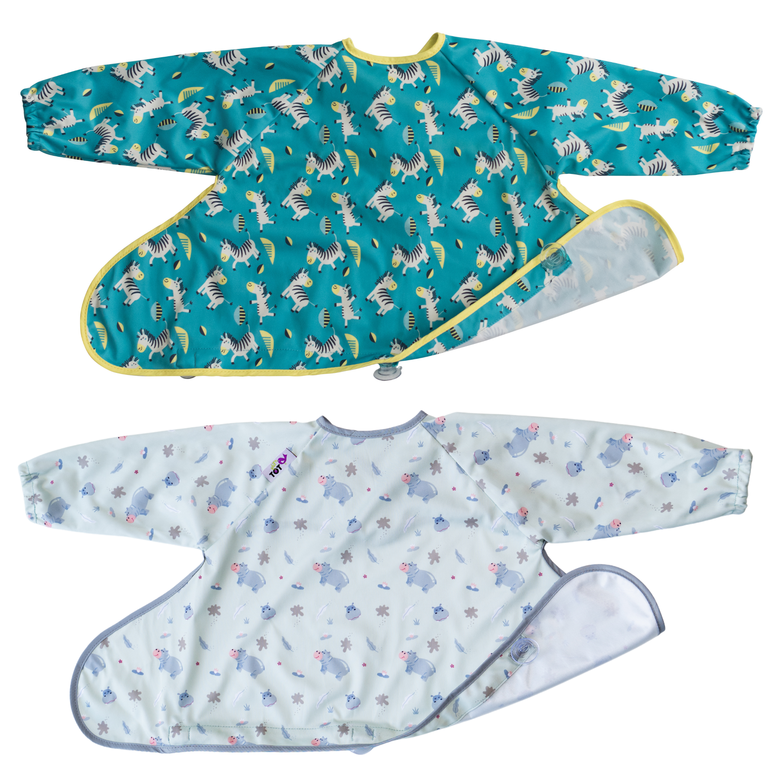 Our Cover & Catch Weaning bib is efficient and simple-to-use with a unique design that adheres to highchairs, trays, and other smooth surfaces, trapping any dropped food and mess. The Cover & Catch bibs' full coverage, long-sleeves, and water-resistant fabric easily protect baby’s clothes and make mess clean-up a breeze! Say goodbye to cumbersome cleaning with this perfect bib for weaning, baby-led weaning, and self-feeding – let baby explore mealtime with confidence while you enjoy less washing and scrubbing!