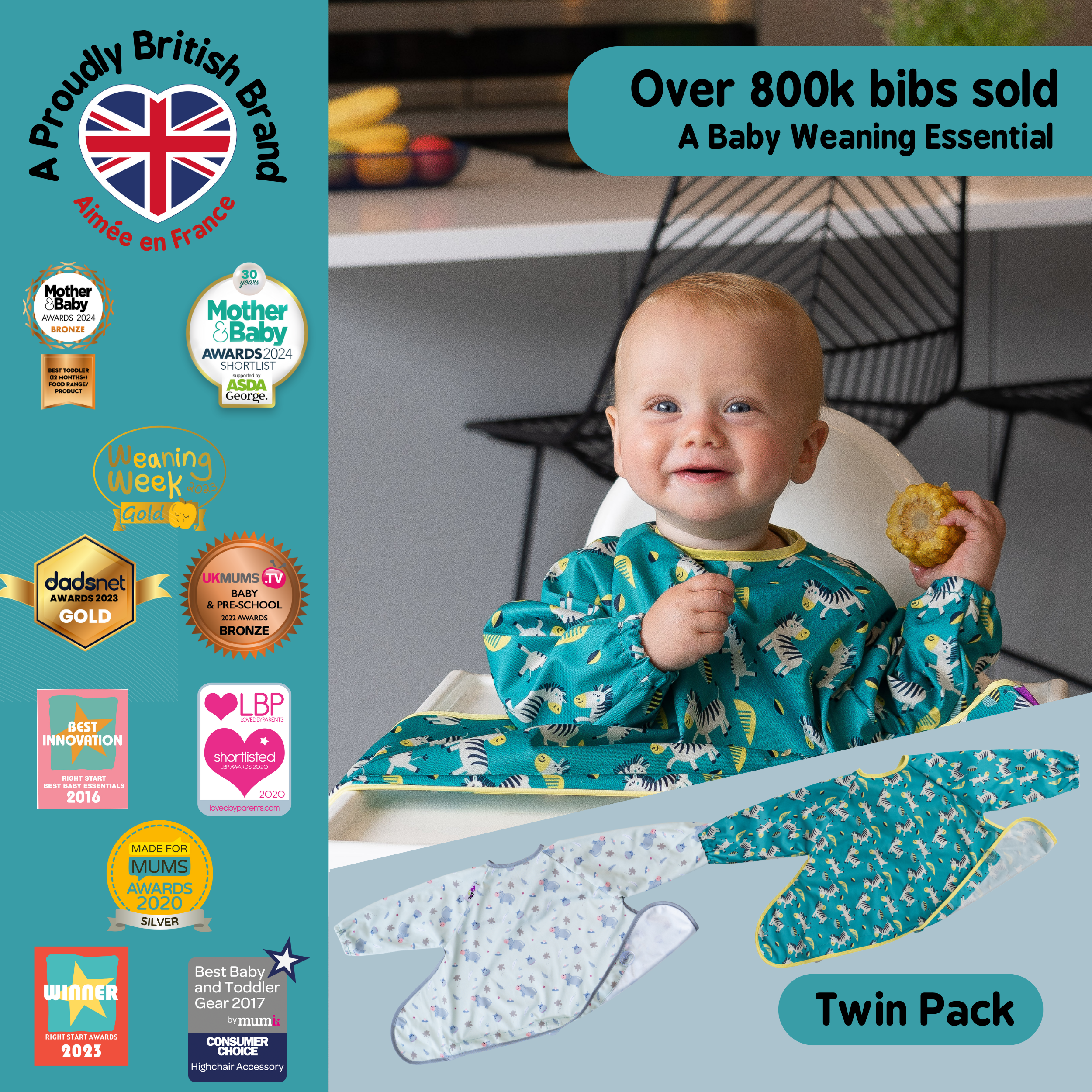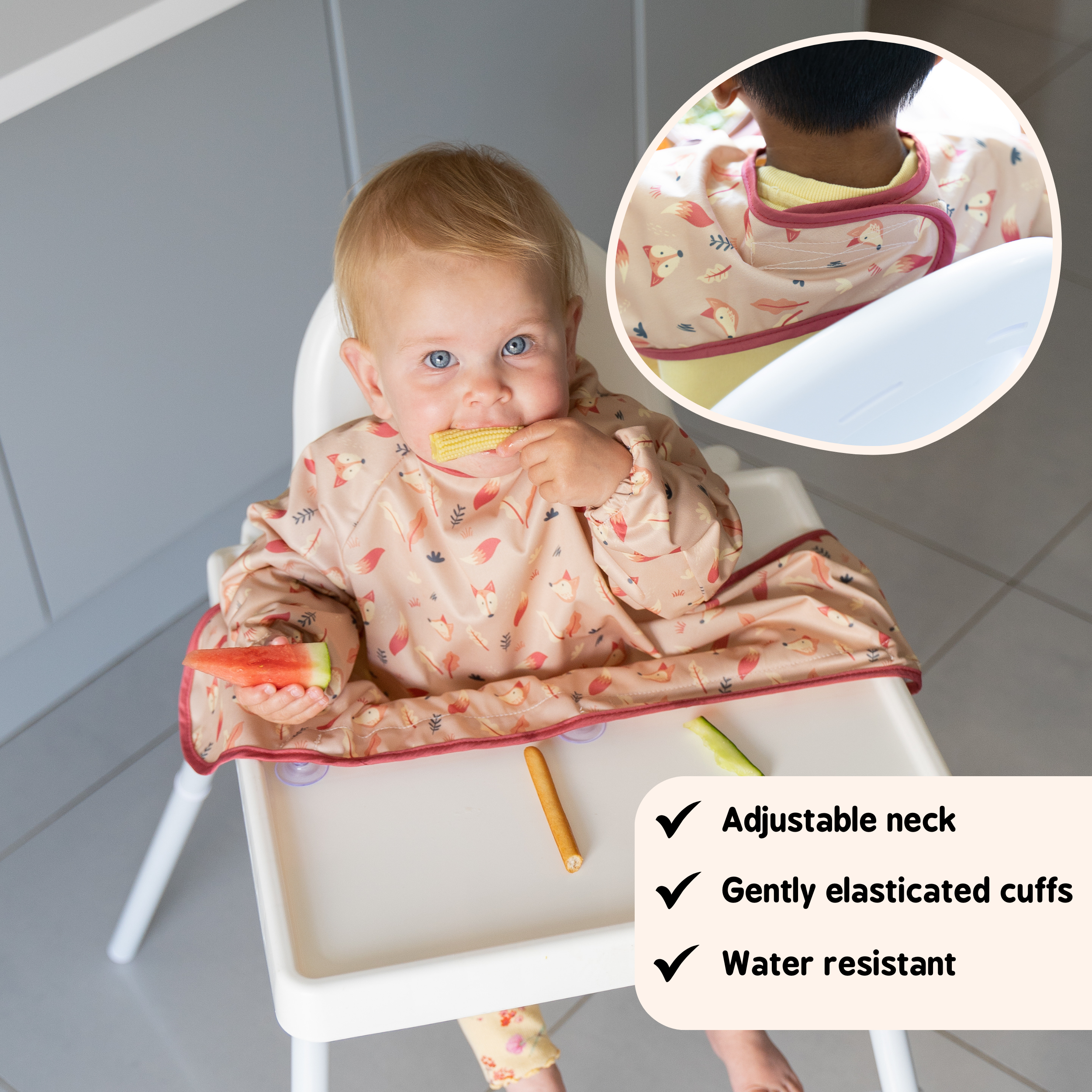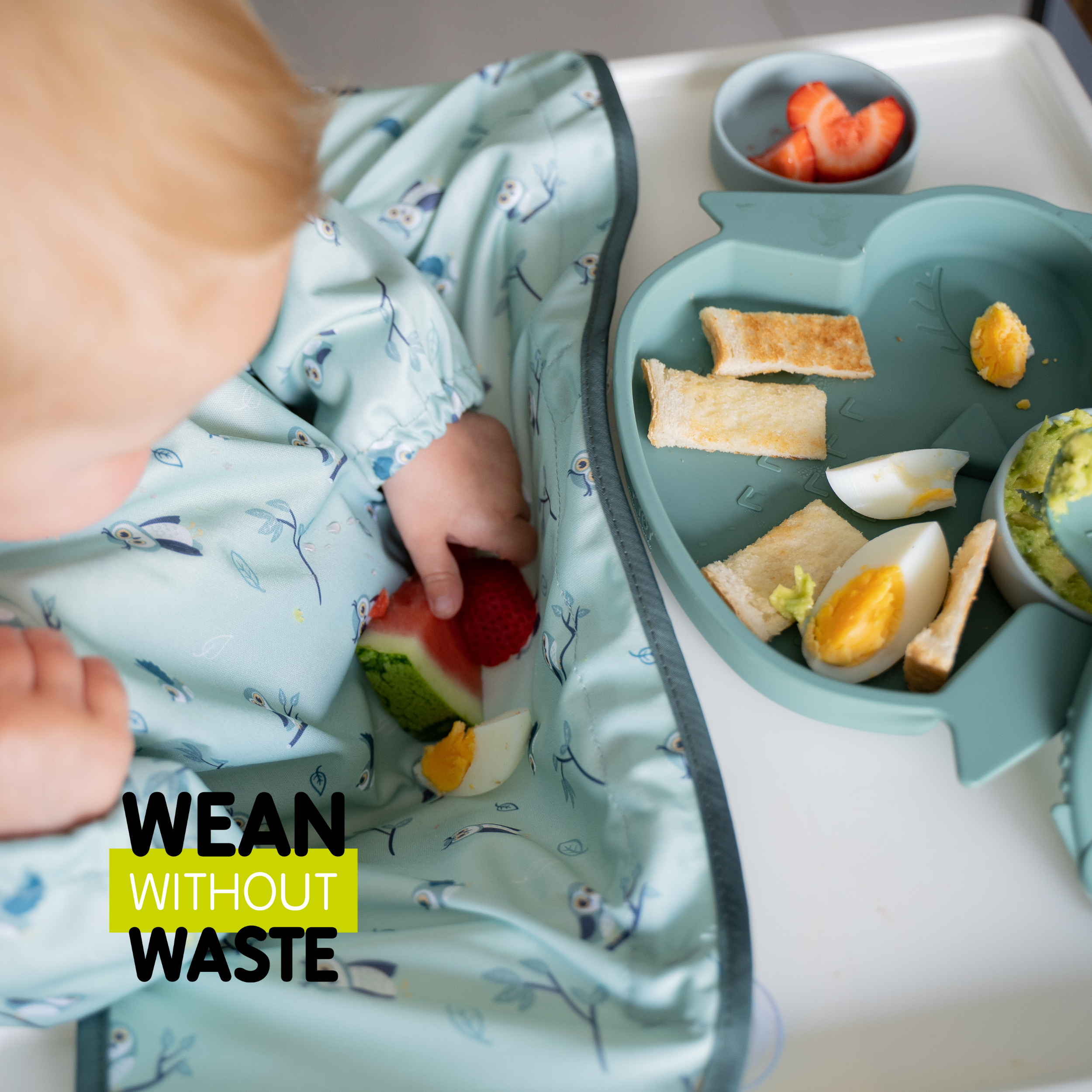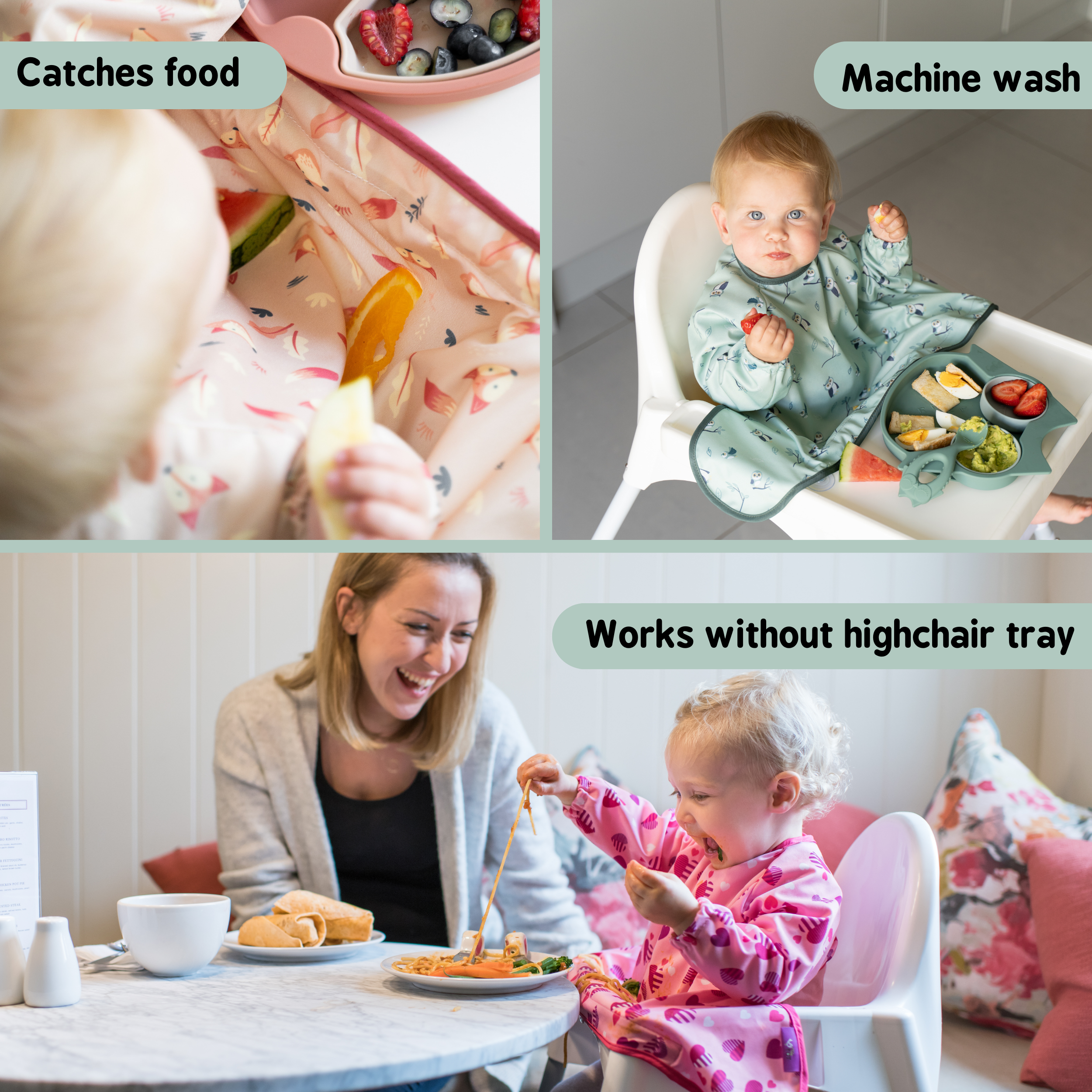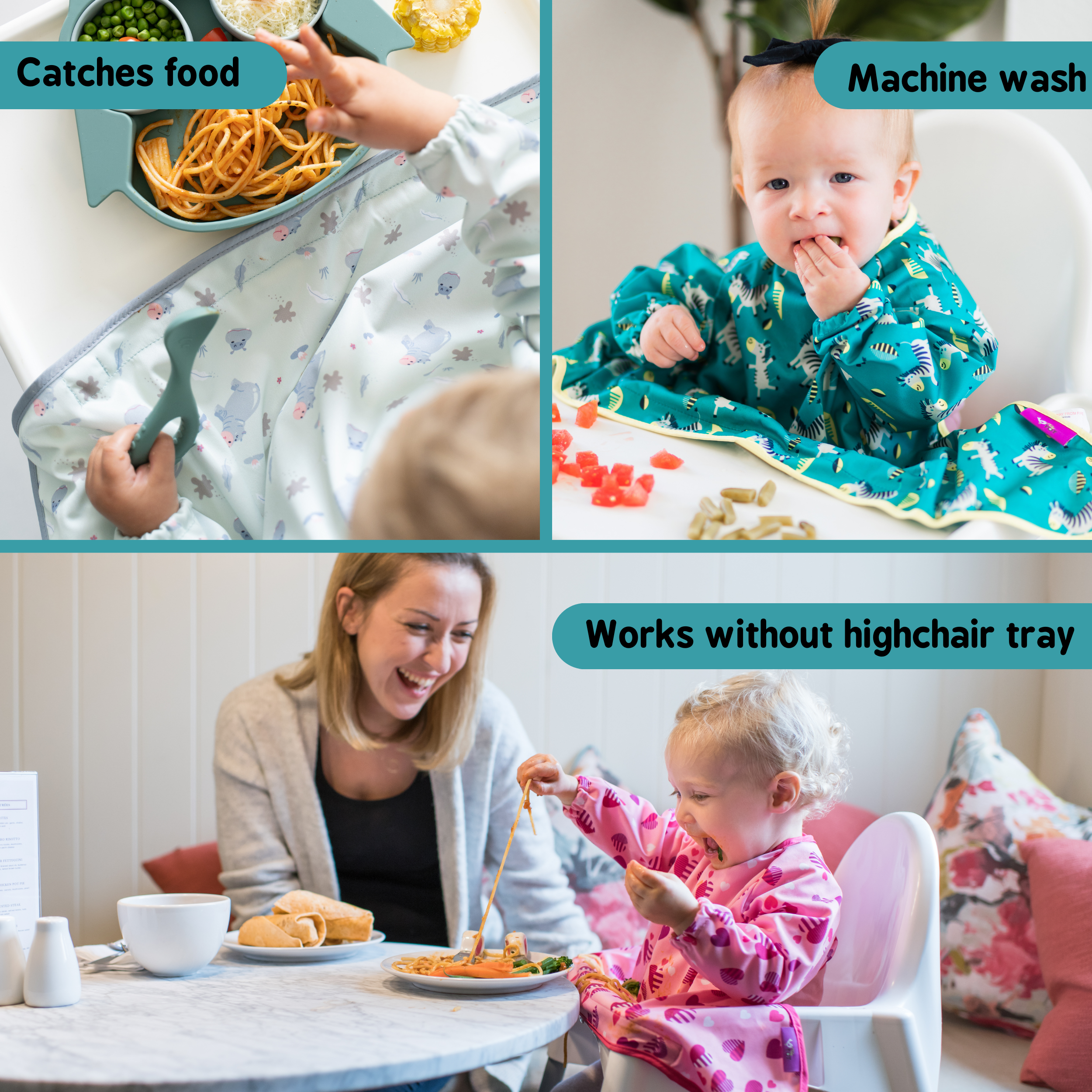 Easier mealtimes with compact weaning bib! Eat, Spill, Catch, Repeat!