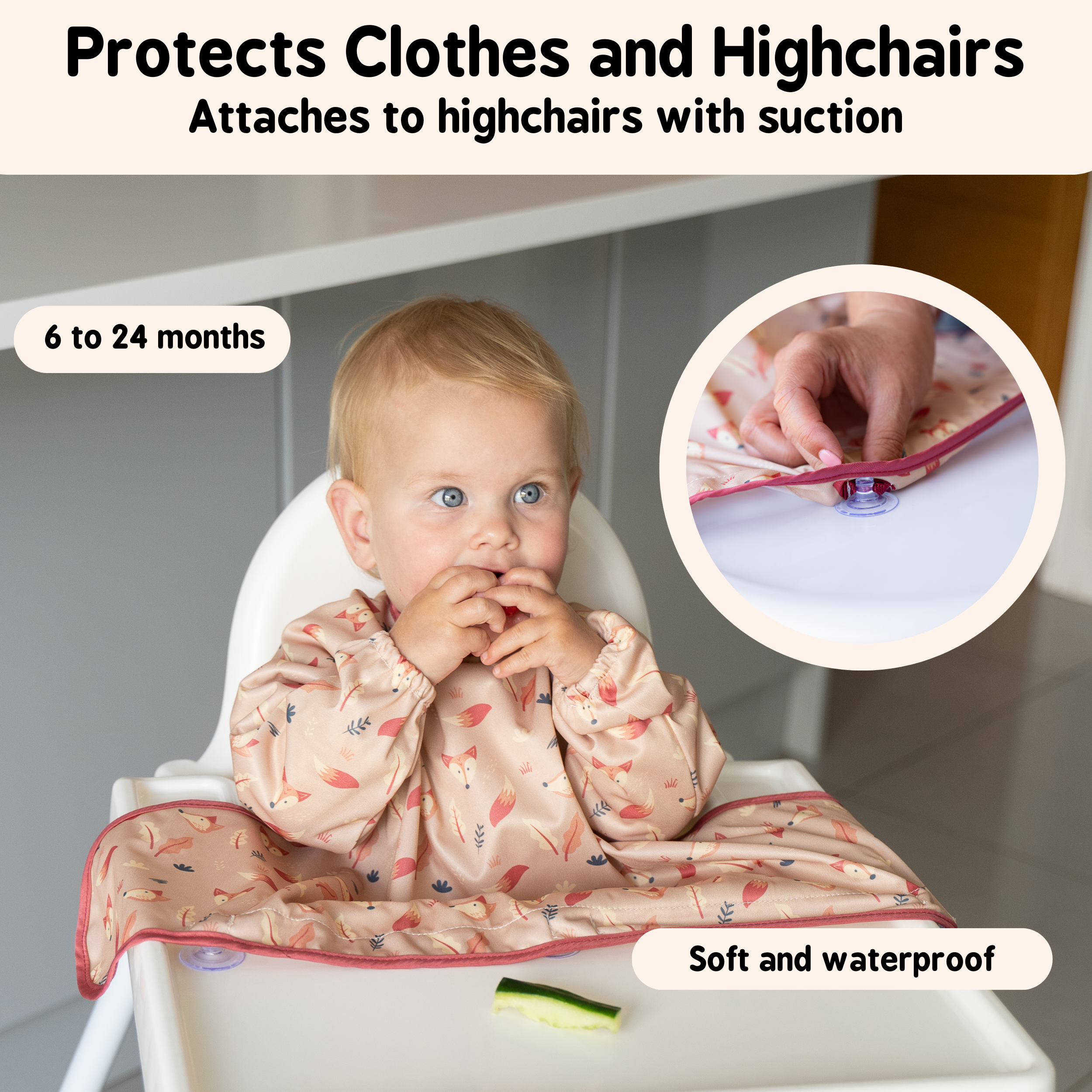 Simply place the bib on your baby, then seat them in their highchair or booster seat and attach the suction cups to the highchair, highchair tray, or table surface. Moisten the suction cups slightly to aid suction if necessary. Fasten the neck fastening for a comfortable fit.