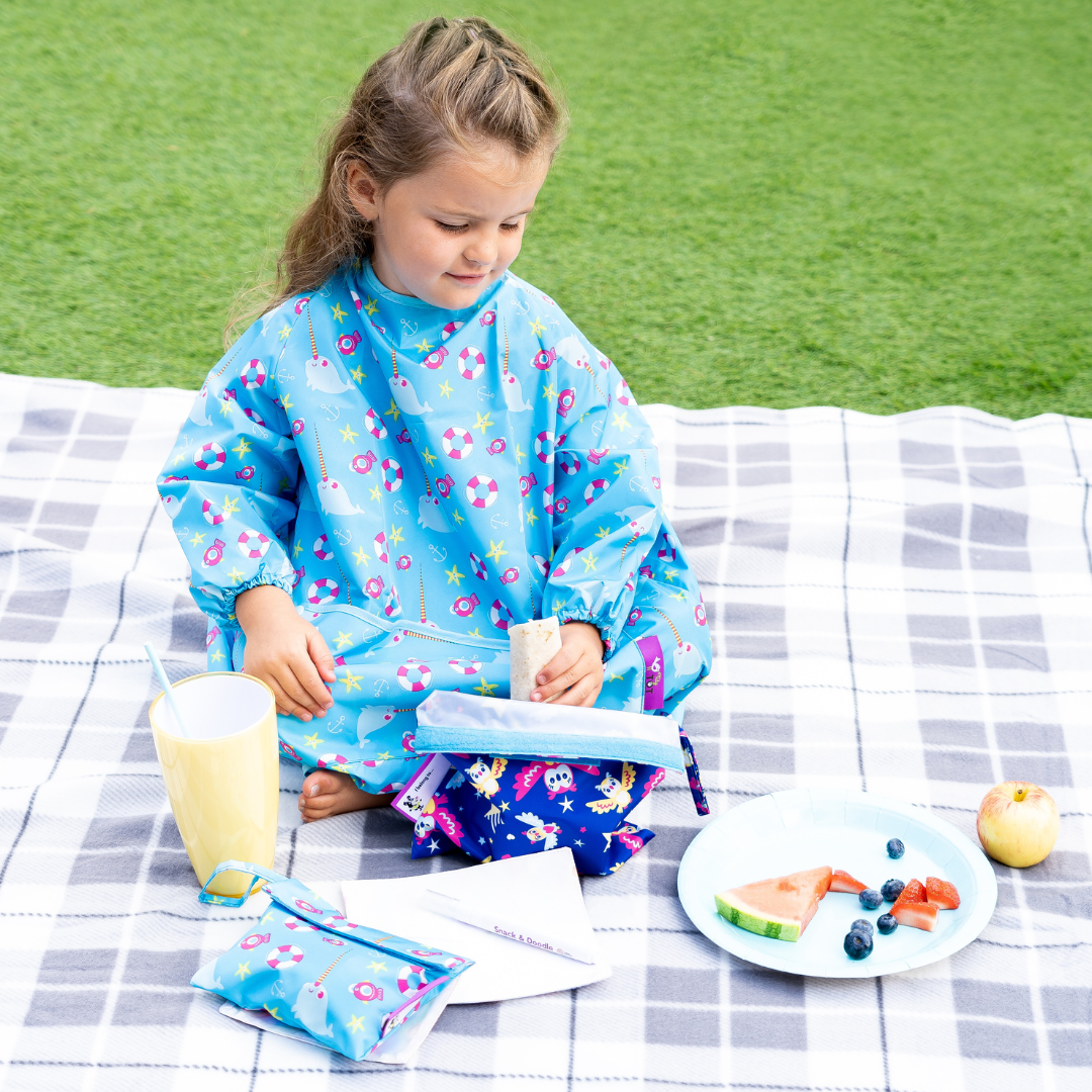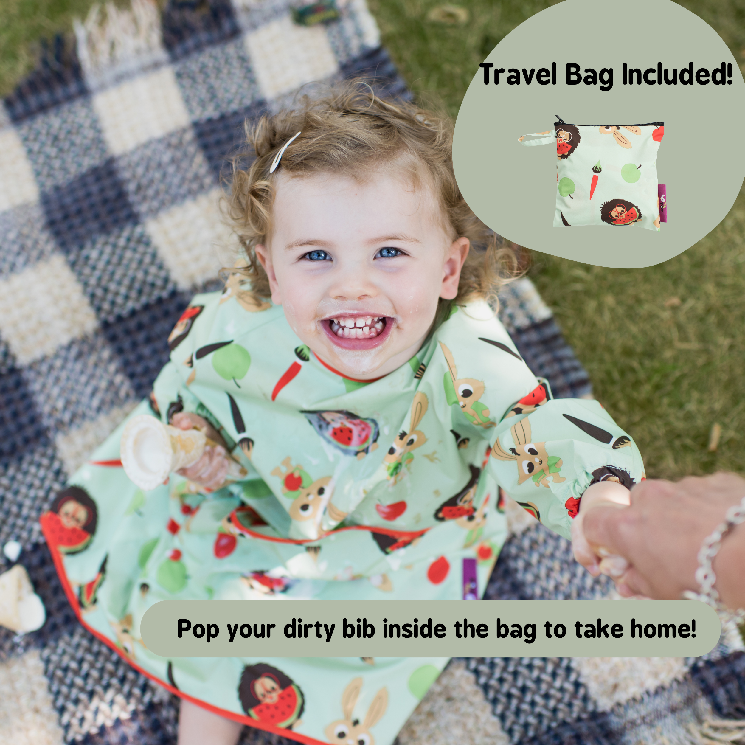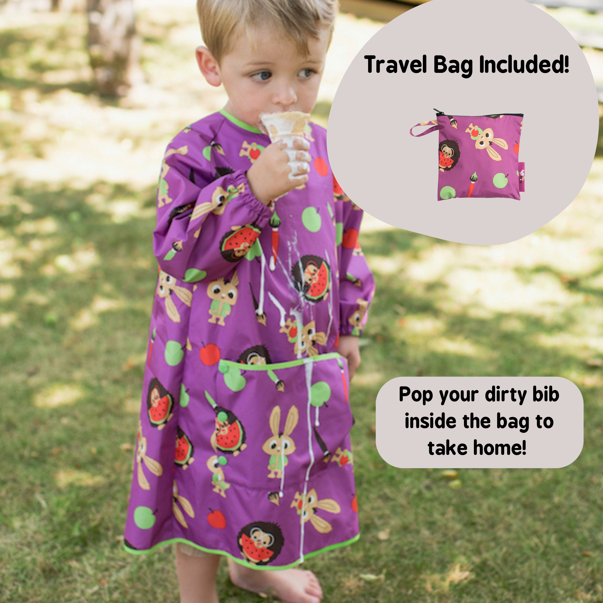 Our Long Length Bibs with sleeves are compatible with any highchair or booster seat, all you need to do is place the bib on your little one and you’re ready to go! This makes it super easy to take our long bibs with you on holidays, for meals out or to pop in their bag for nursery or playschool (ideal paired with our Snack & Doodle!). Available bright and colourful unisex prints that are sure to appeal to babies and cheeky toddlers, our Long Length Bibs with sleeves also come with a handy zippable storage travel pouch, so you can keep any mess away from the rest of your changing bag.