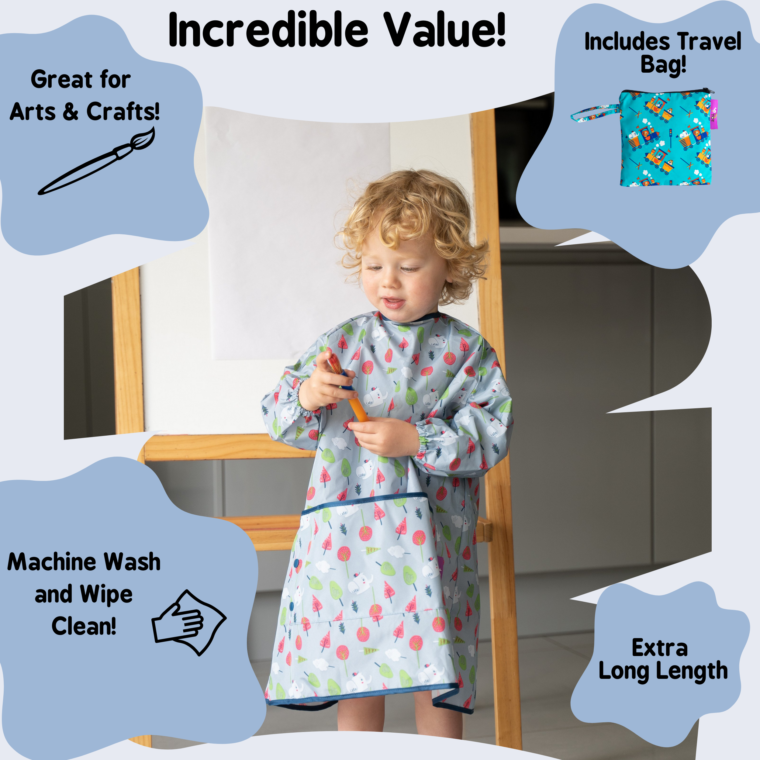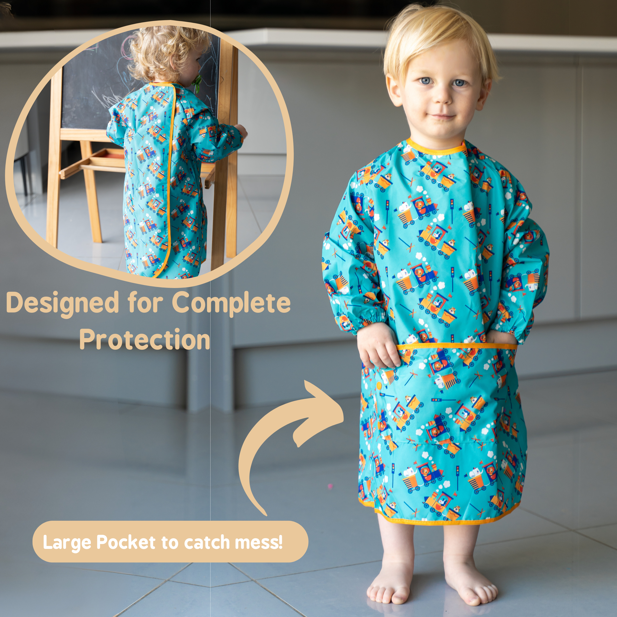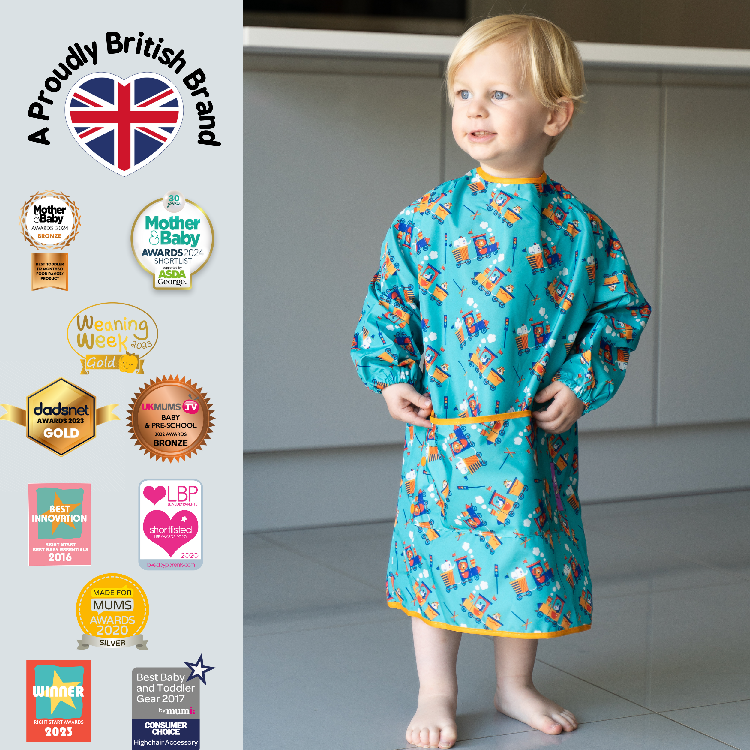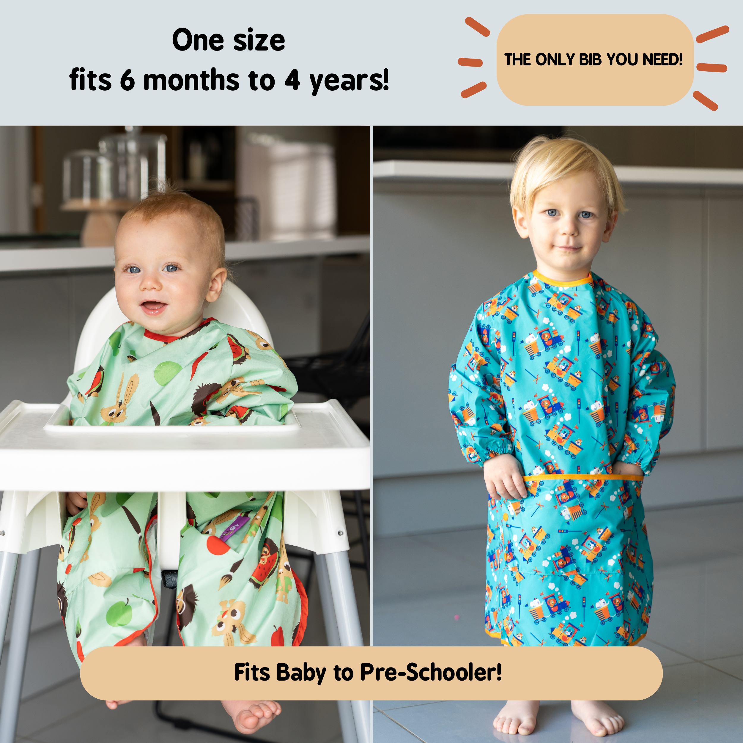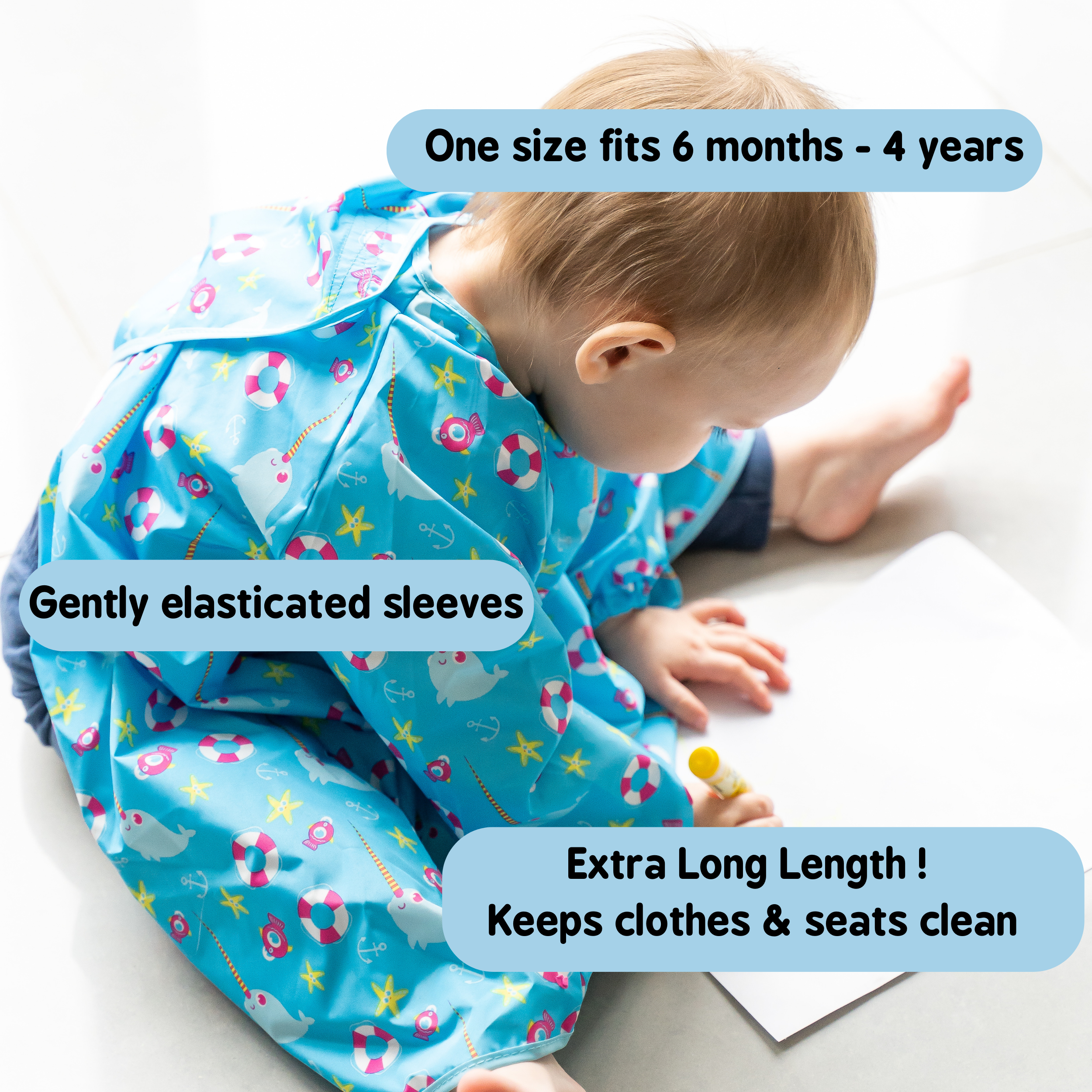 Our Long Length Bib with sleeves is a great all-rounder and is sure to be your new best friend! This extra-long length and long sleeve bib is suitable for babies from 6 months up to toddlers of 4 years, so can grow and adapt with your little one as they go from baby weaning right up to toddler mealtimes. Our long bibs are also great for messy play and arts and crafts. Our Long Length Bibs with sleeves are made from a super-soft, lightweight, durable AND waterproof fabric, meaning that it is free from scratchy and uncomfortable plastic and fabric for your little one’s comfort, all whilst keeping their clothes fully protected. As all babies and toddlers are different, our clever Long Length Bib with sleeves also has an adjustable neck fastening to fit babies from the early weaning stages (6 months +) to toddlers up to 4 years. Comfortable to wear and with elasticated cuffs to help stop messy arms and sleeves, our Long Length Bibs with sleeves really will last and grow with your little one.