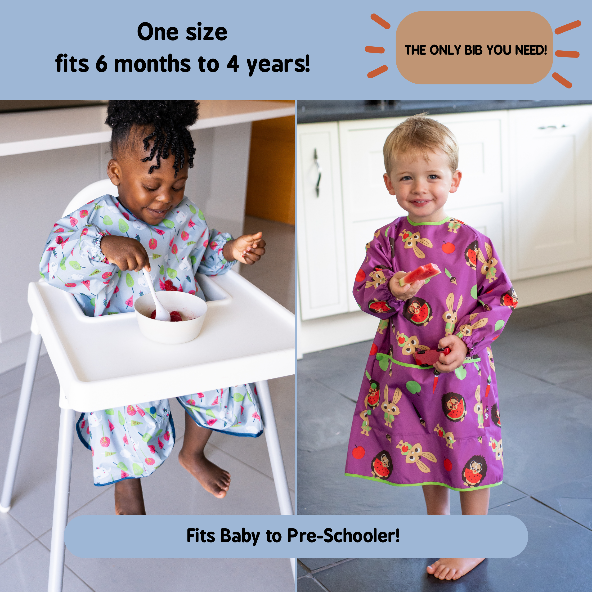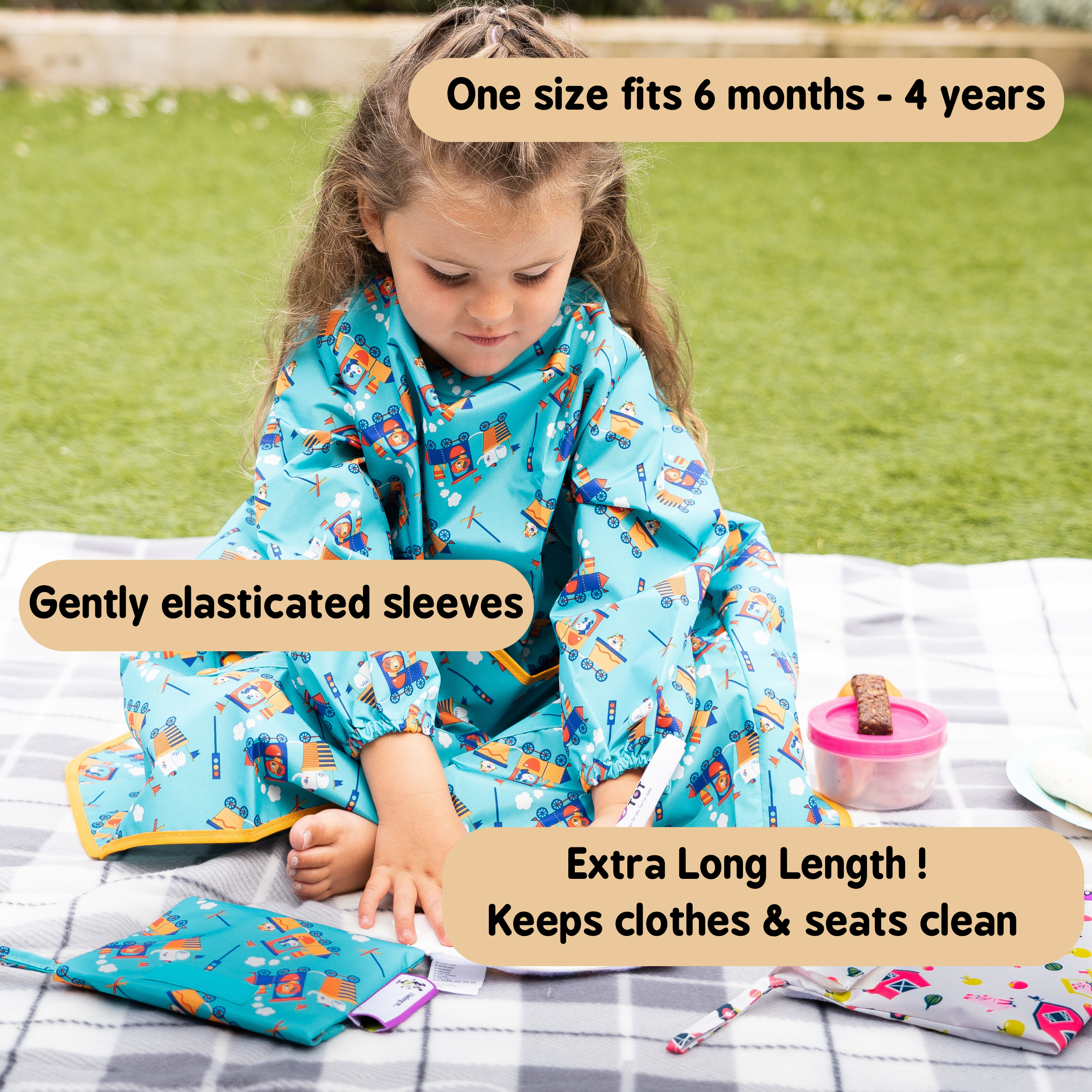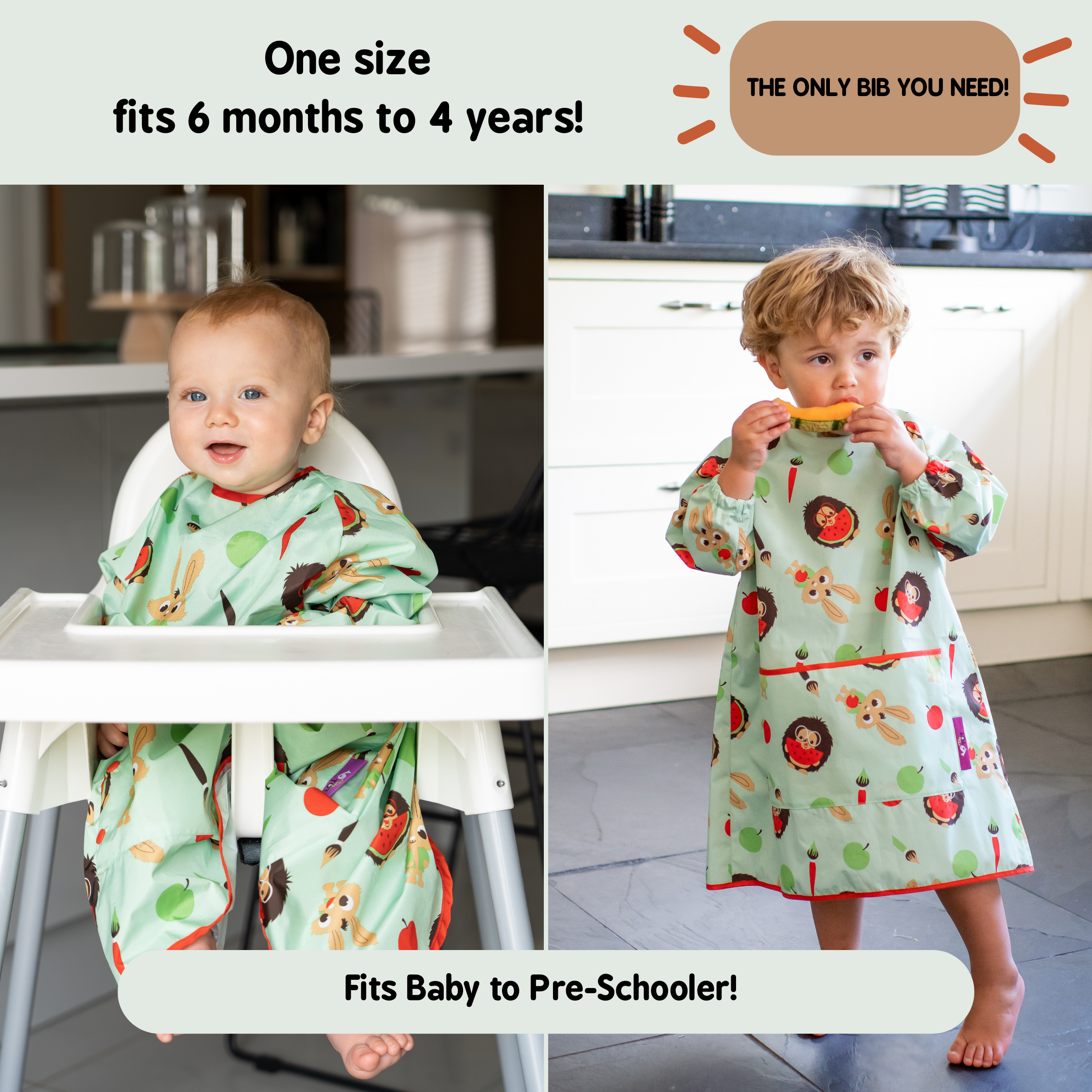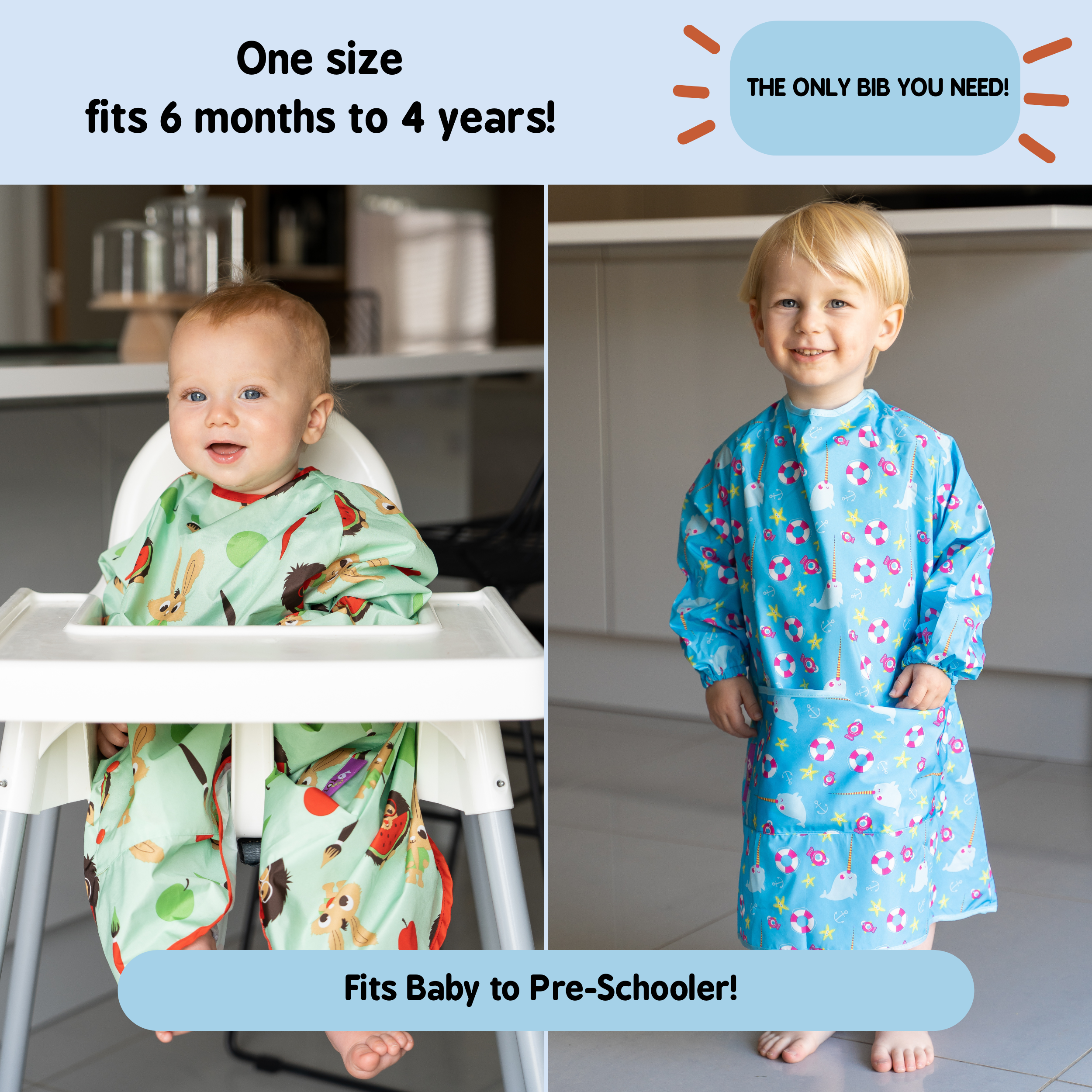 With 360 coverage, long sleeves, extra long length to cover laps and a clever side-opening crumb-catcher pocket, this is the only long bib you will ever need! Perfect for mealtimes, playtimes and messy play times, simply wipe-clean or machine wash and the quick-drying fabric will be ready to go again before you know it!