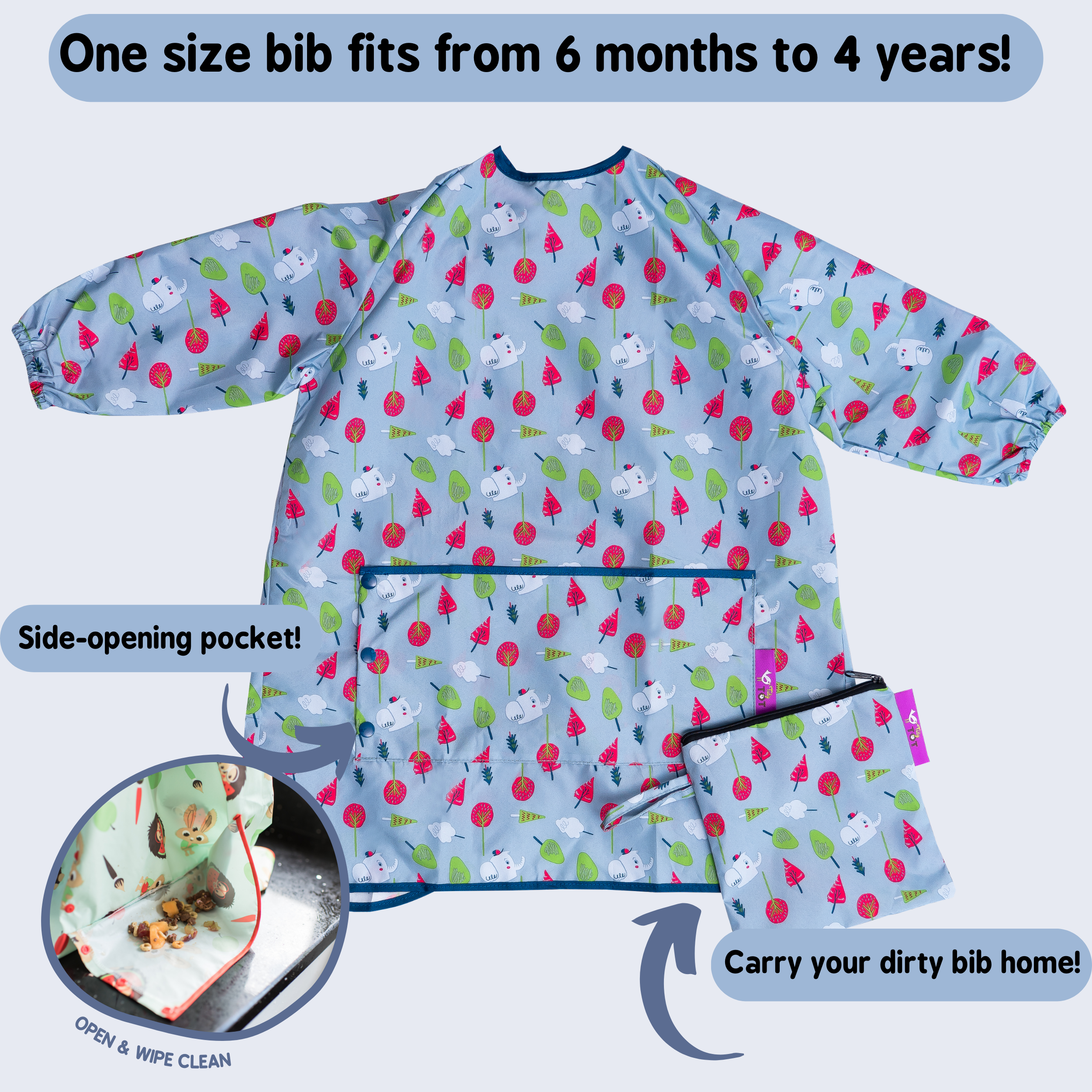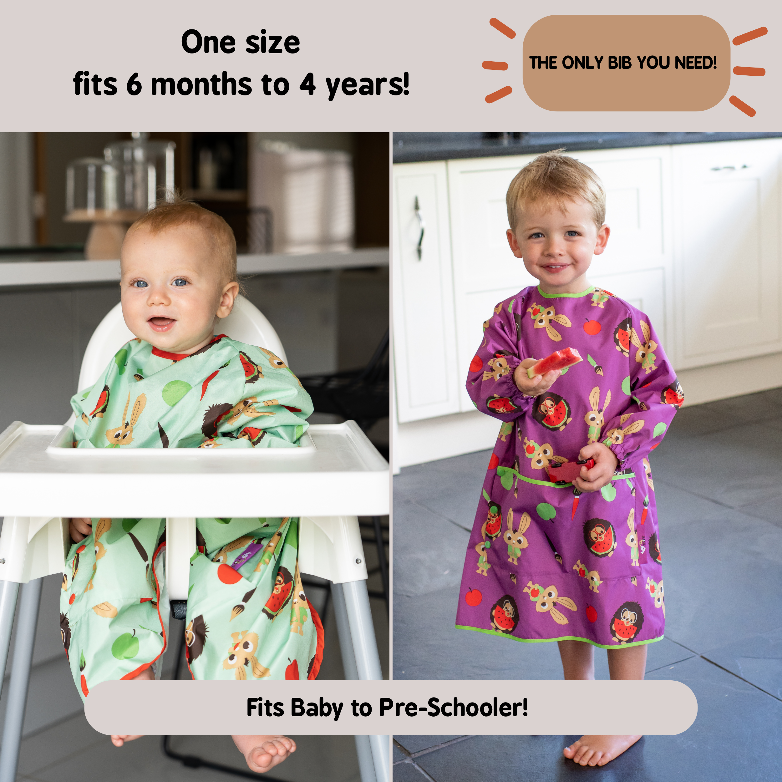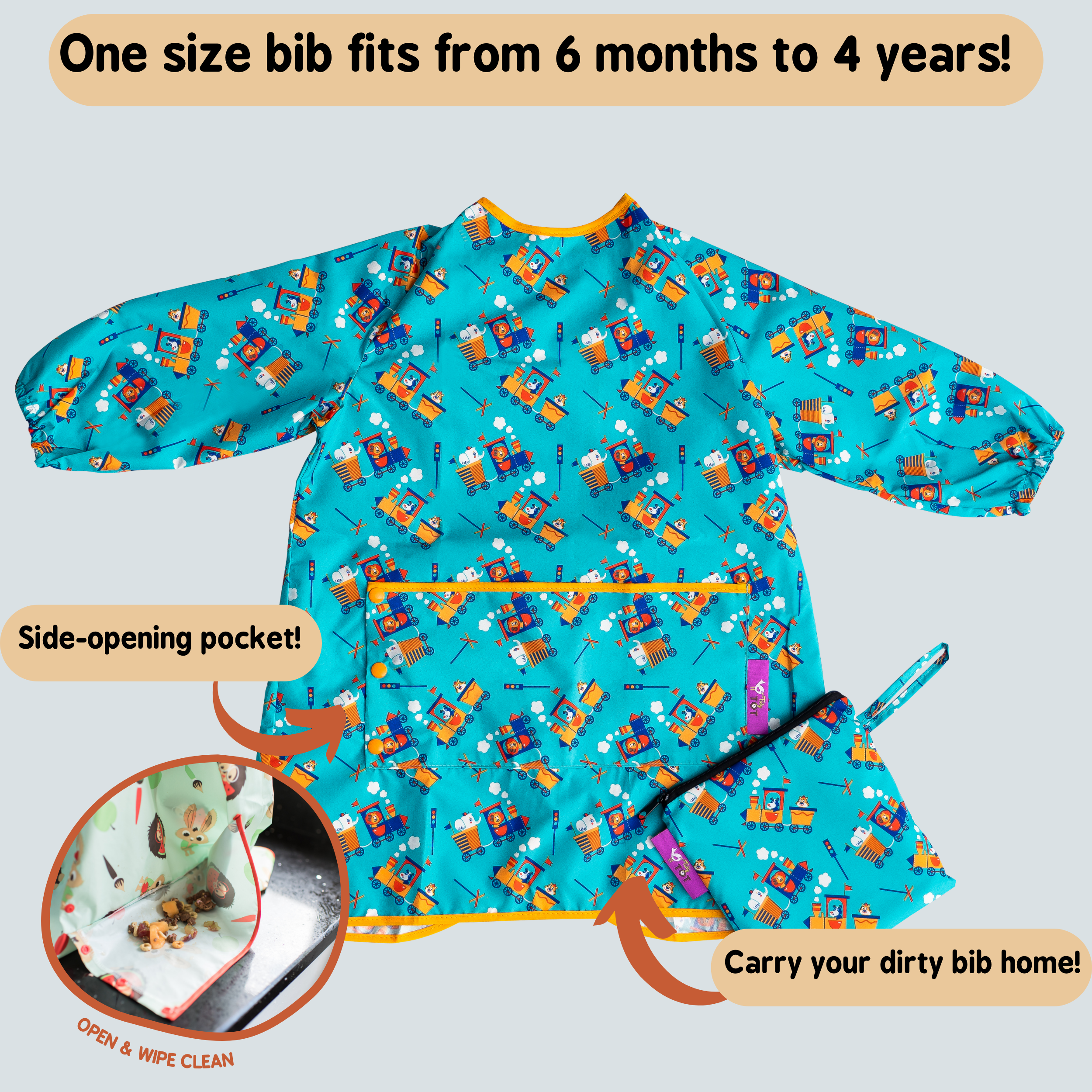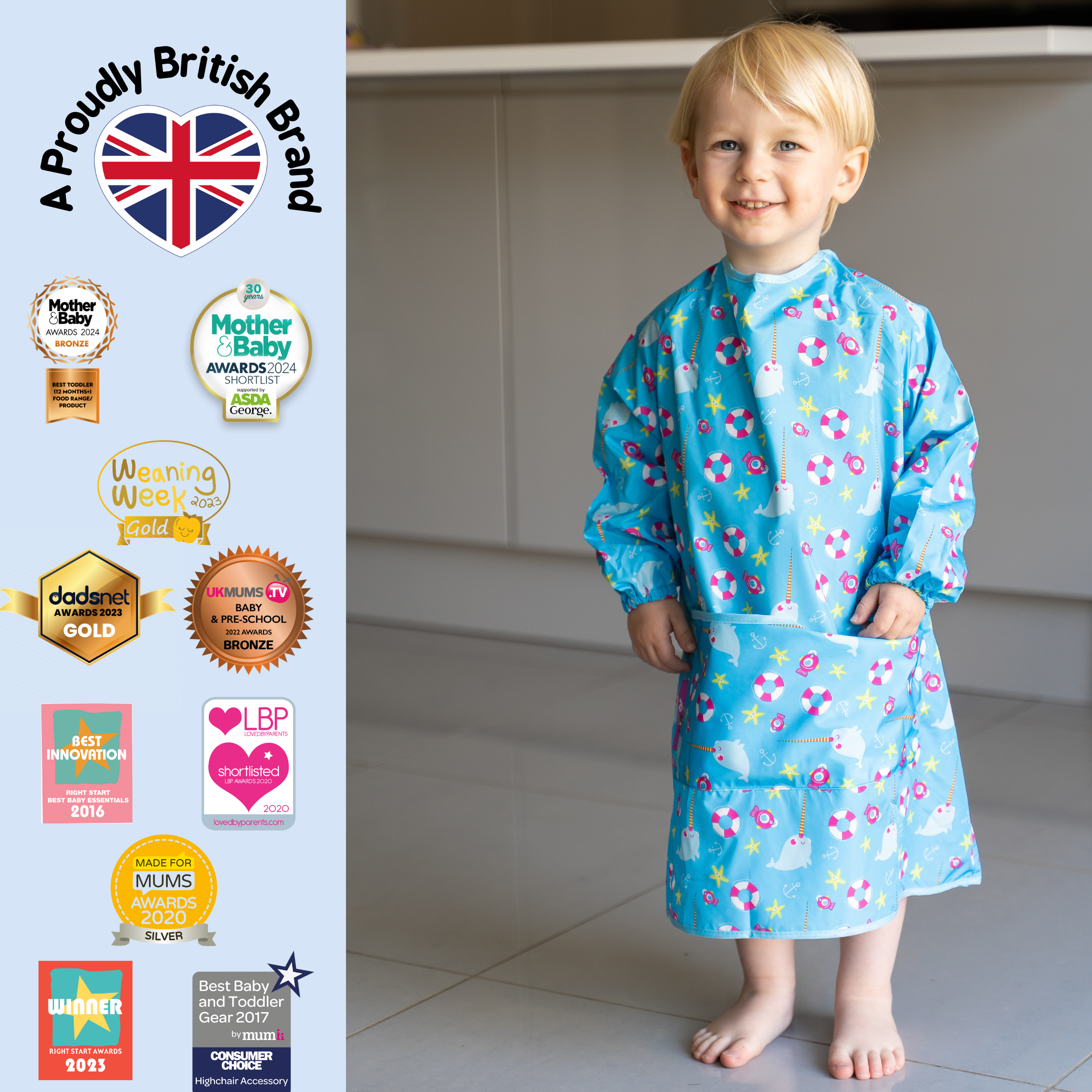 With 360 coverage, long sleeves, extra long length to cover laps and a clever side-opening crumb-catcher pocket, this is the only long bib you will ever need! Perfect for mealtimes, playtimes and messy play times, simply wipe-clean or machine wash and the quick-drying fabric will be ready to go again before you know it!