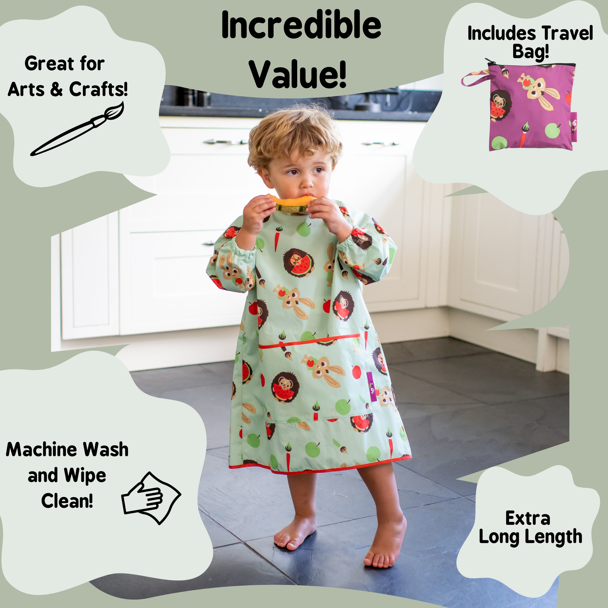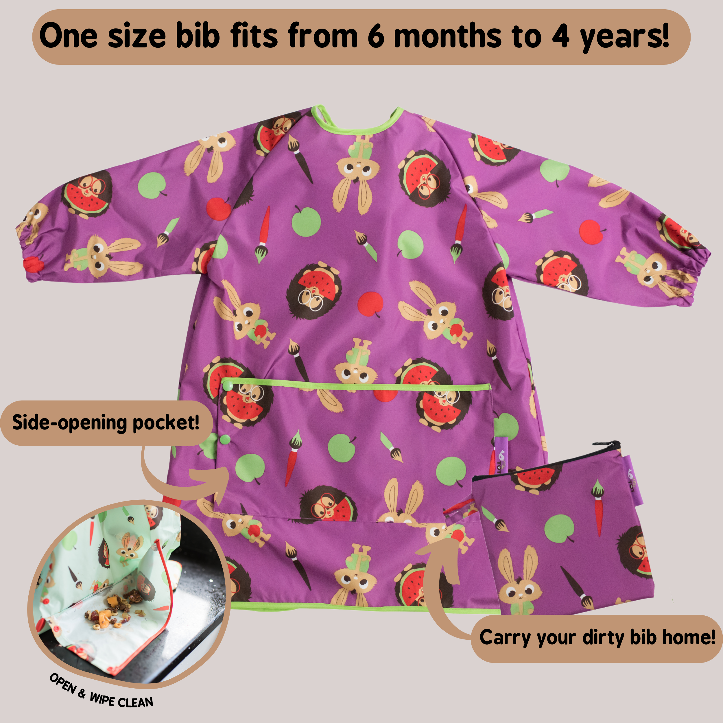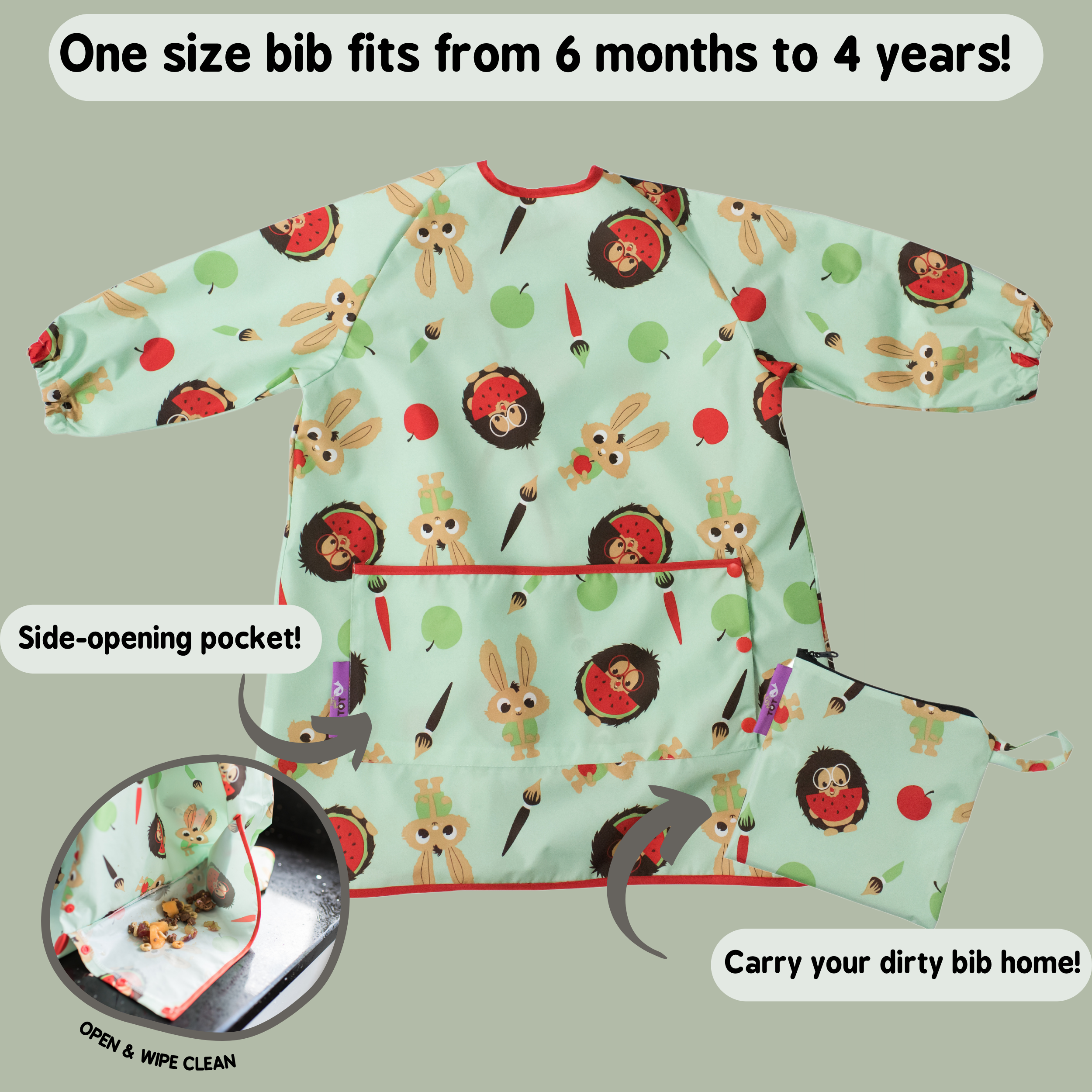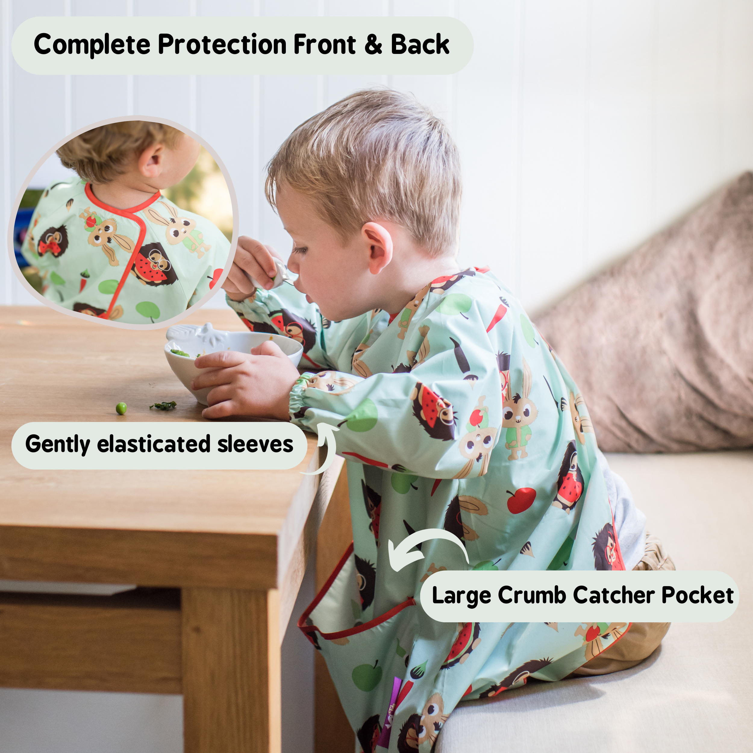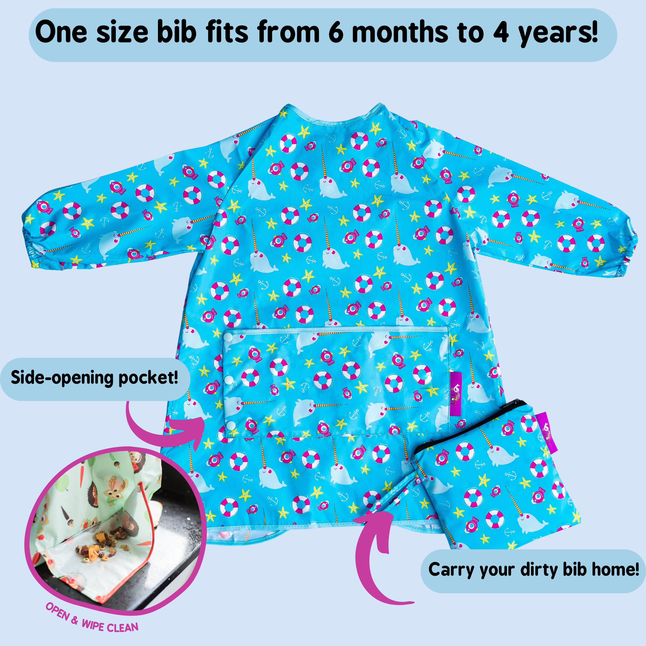 With 360 coverage, long sleeves, extra long length to cover laps and a clever side-opening crumb-catcher pocket, this is the only long bib you will ever need! Perfect for mealtimes, playtimes and messy play times, simply wipe-clean or machine wash and the quick-drying fabric will be ready to go again before you know it!