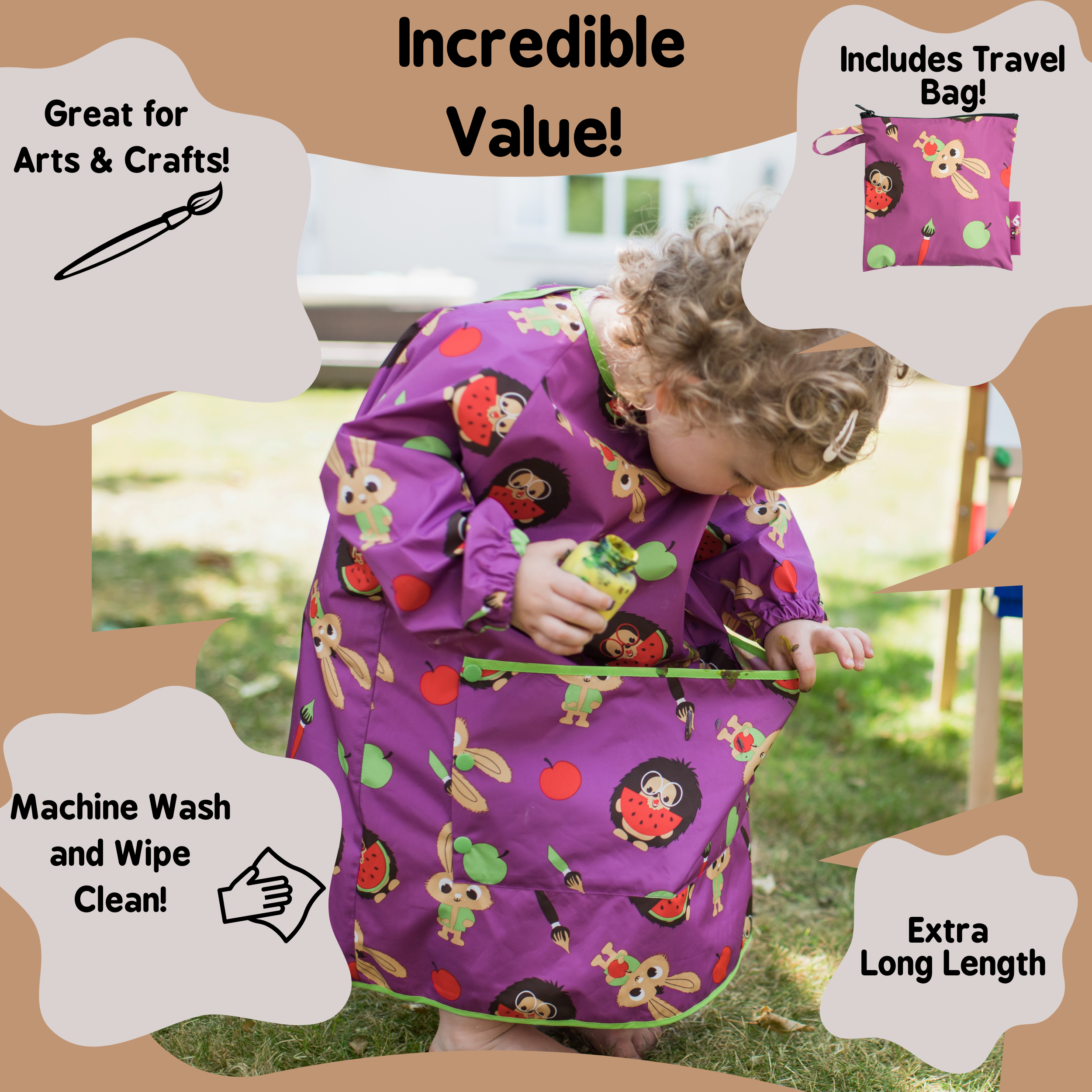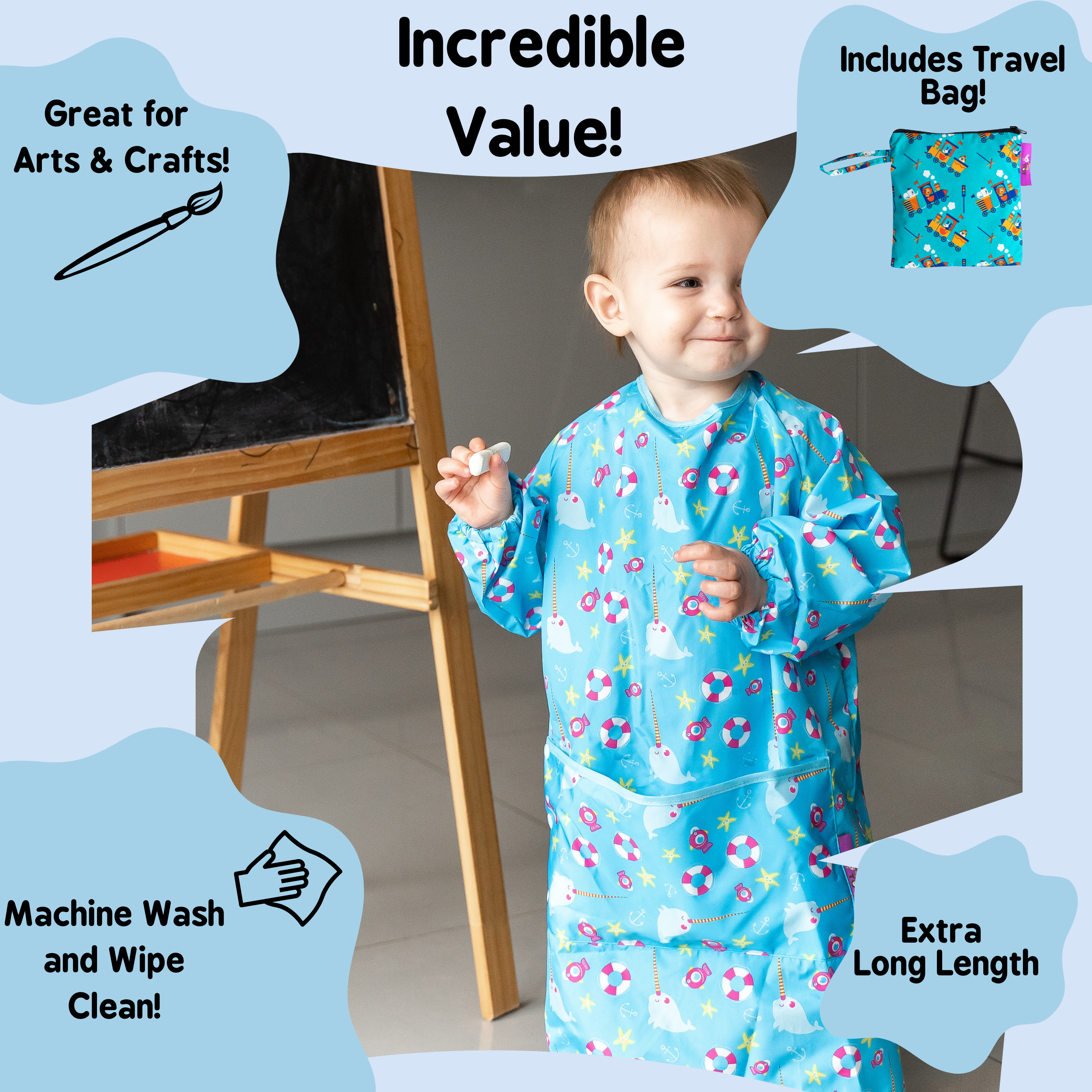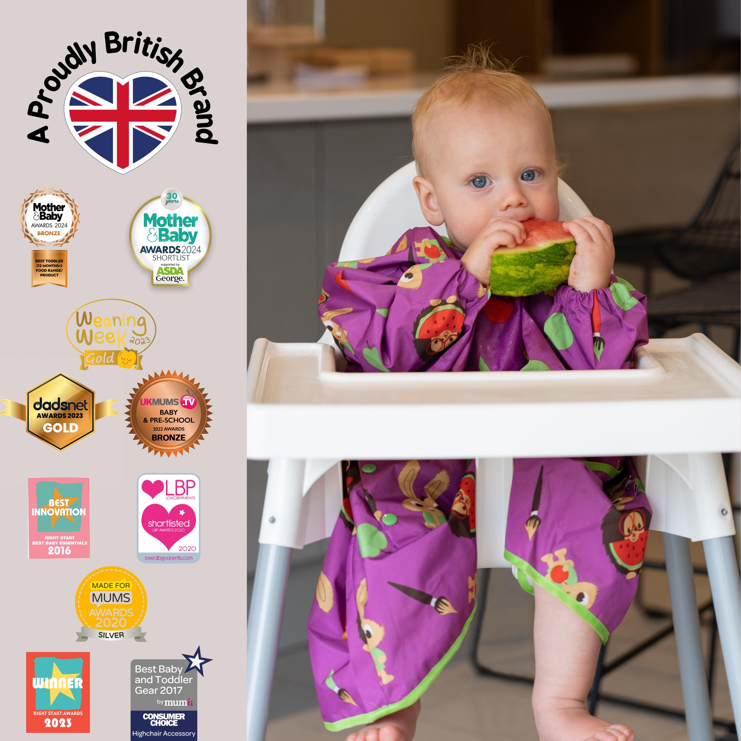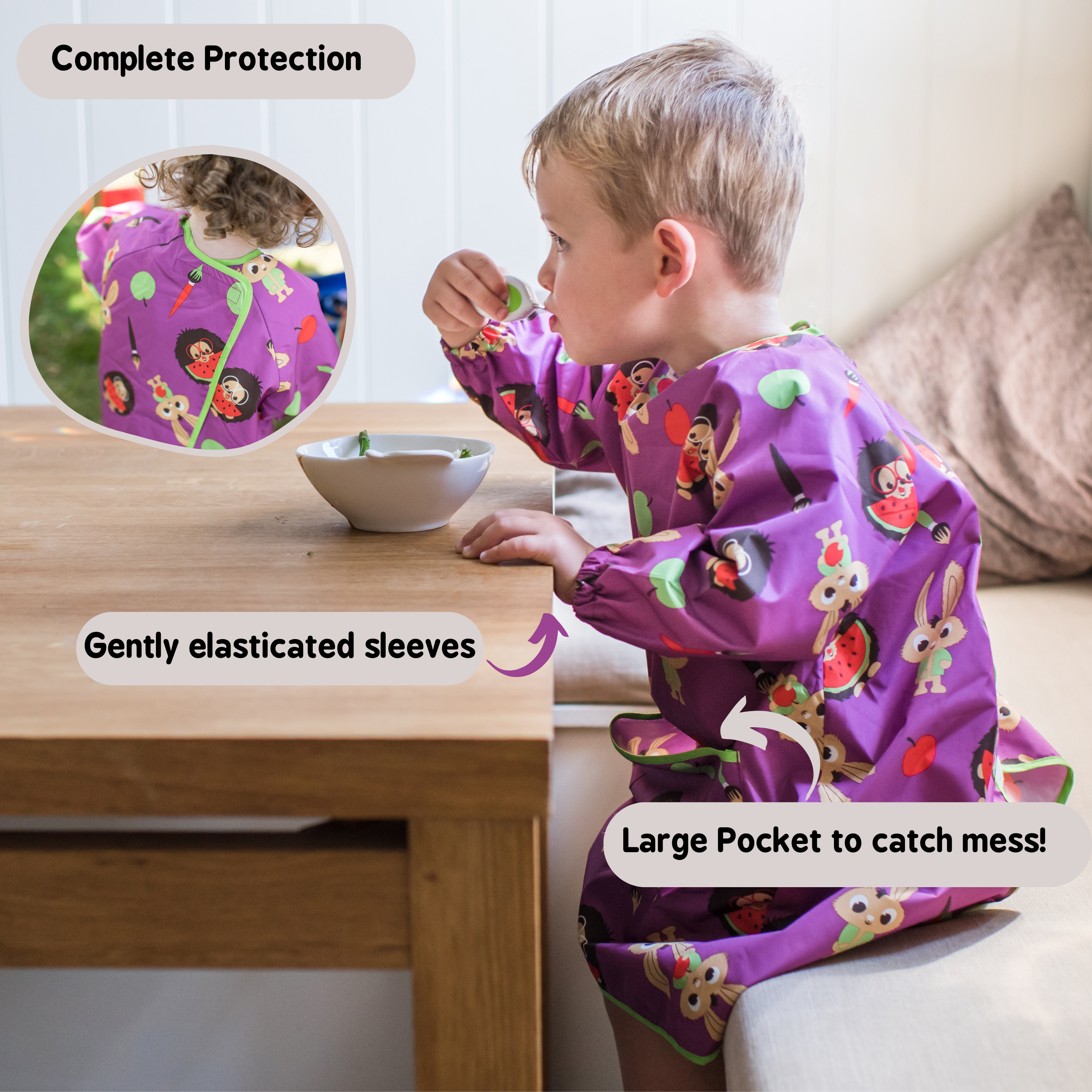 With 360 coverage, long sleeves, extra long length to cover laps and a clever side-opening crumb-catcher pocket, this is the only long bib you will ever need! Perfect for mealtimes, playtimes and messy play times, simply wipe-clean or machine wash and the quick-drying fabric will be ready to go again before you know it!