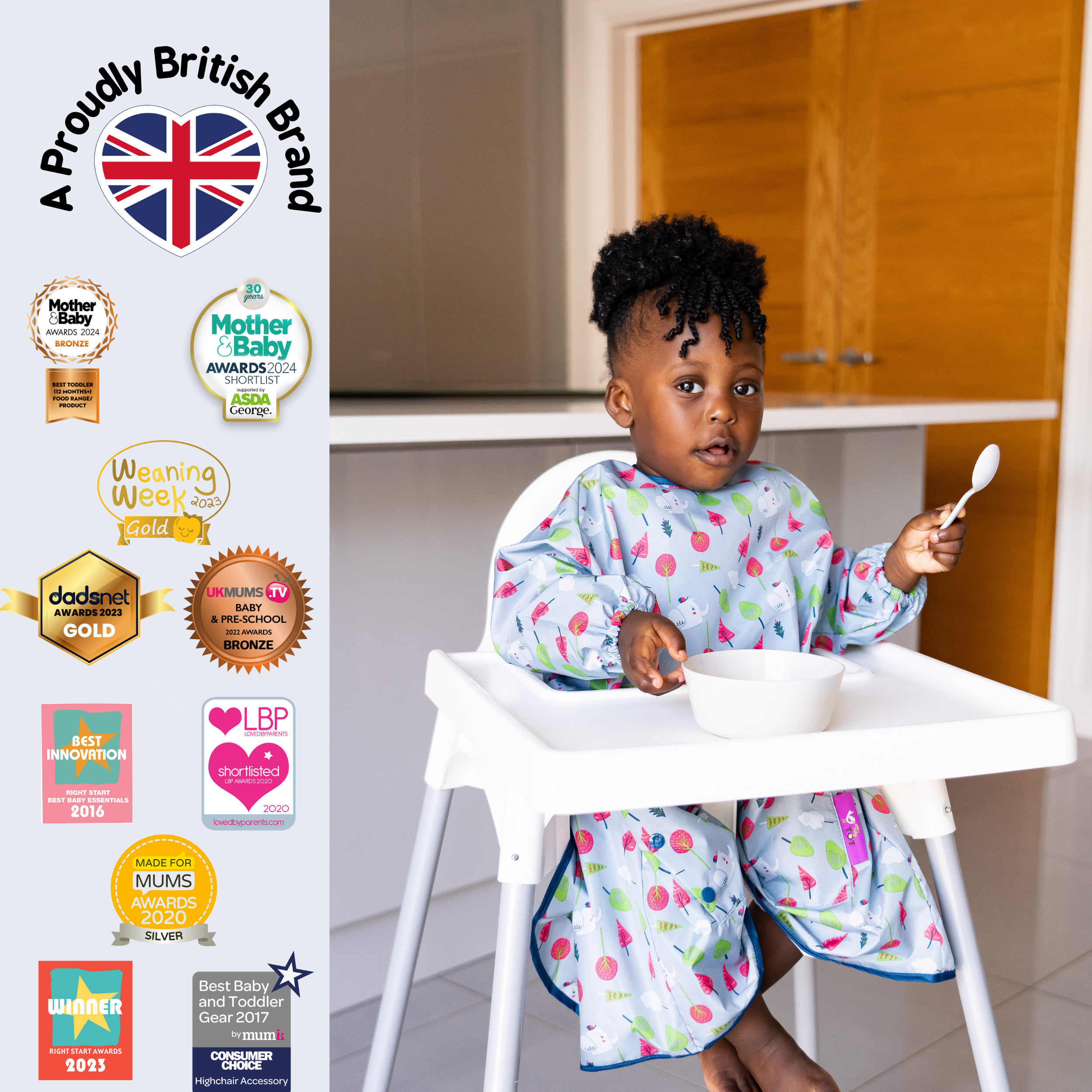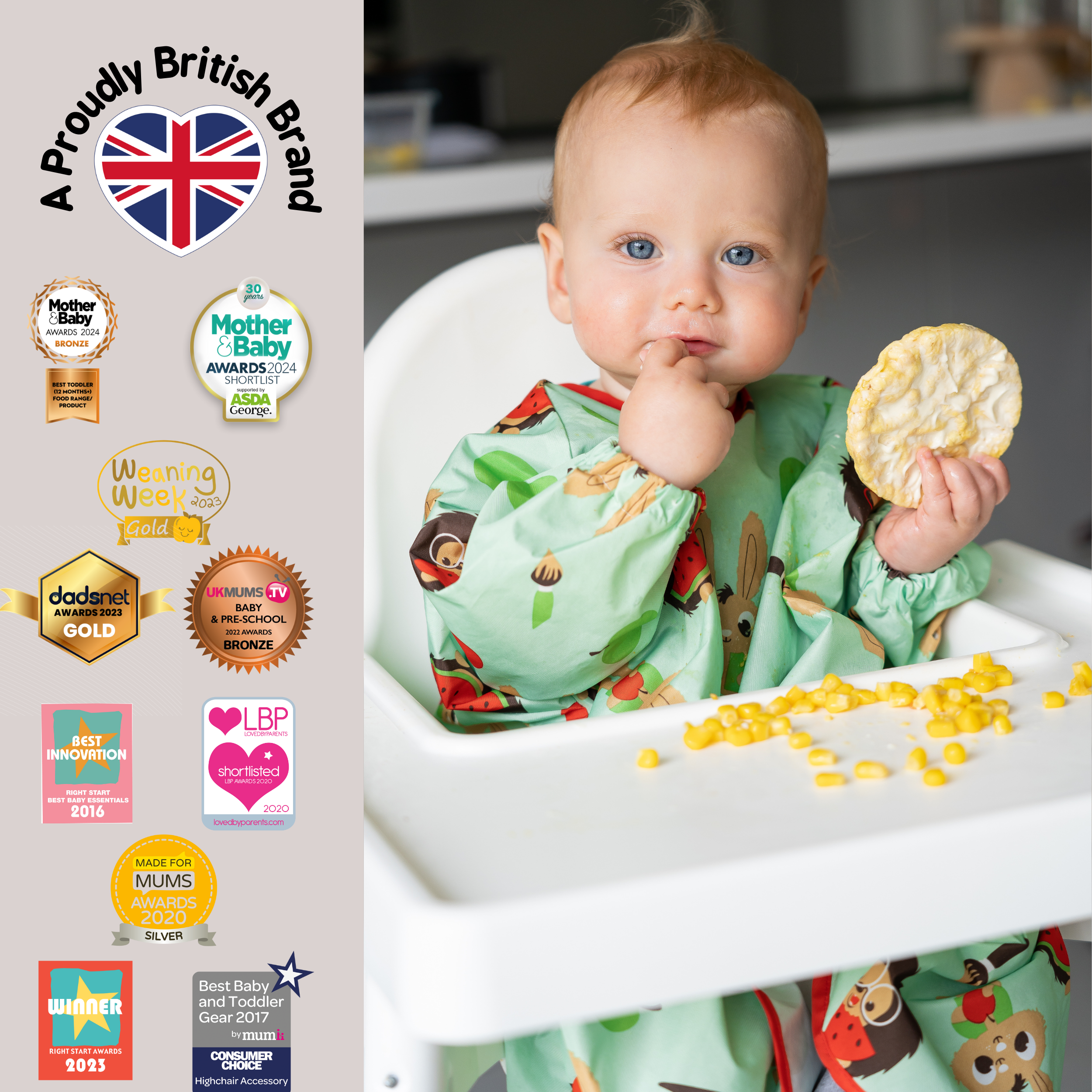 We are proud to offer the longest water-resistant coverall bib on the market and our Long Length Bib with sleeves protects laps and clothes from the inevitable dropping of food, mess and spills that come with having a little one. Our Long Length Bib also has the benefit of being a long bib with sleeves, too, so it really is designed to cover all! With 360º protection – front, back and side – our Long Length Bib with sleeves will keep your little one clean and their clothes fully covered and protected, leaving them mess-free. To make cleaning messy faces more fun and interactive, be sure to check out our Bamboo Wash Mitts, too! If you have a messy and active little one, then you’ll know all too well the mess that can be created on a daily basis, whether it be at mealtimes or playtime, which is what our long bibs and other weaning products are here to help with.