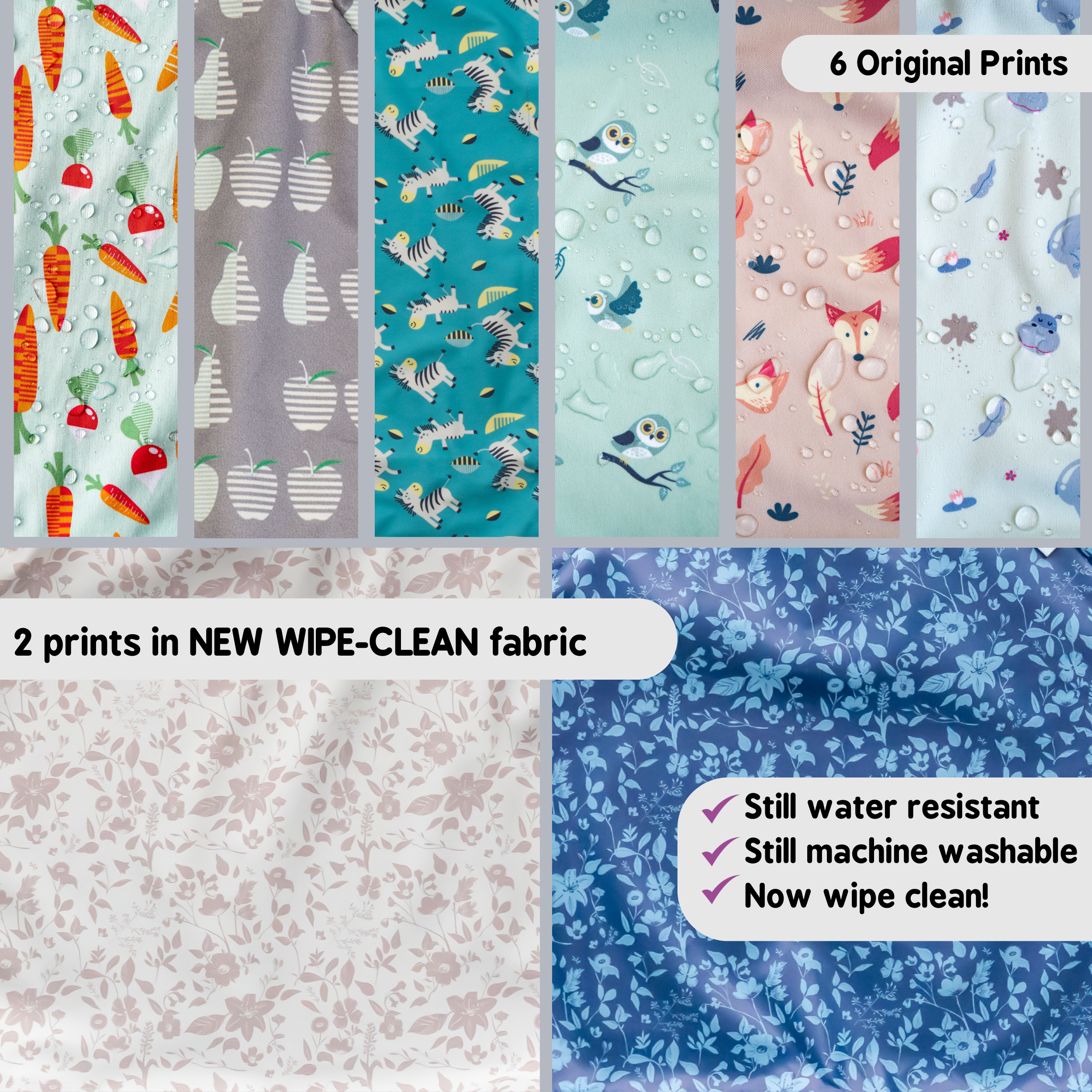 Crafted from super soft, water-resistant fabric, these handy bibs are easy wipe-clean, or machine washable.
