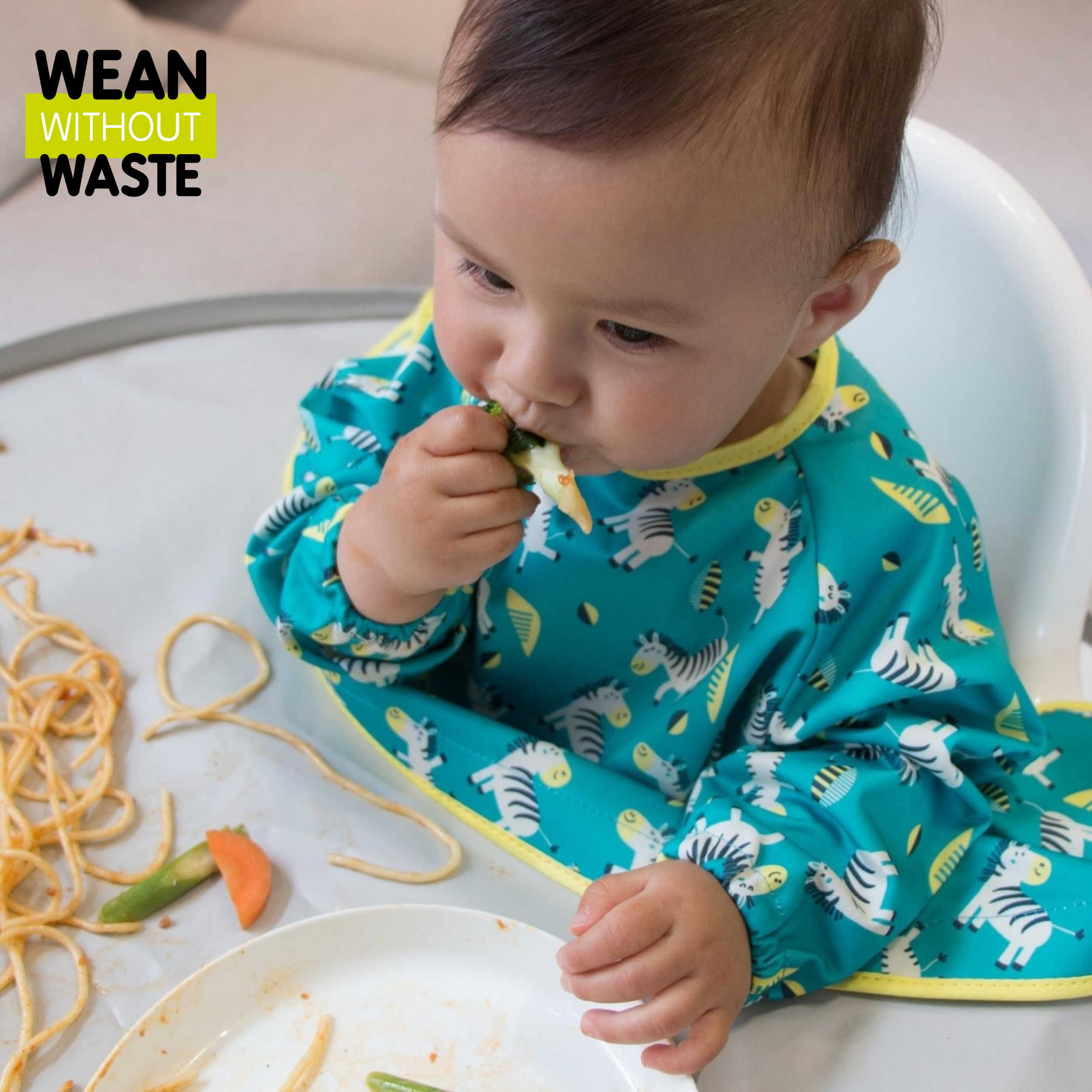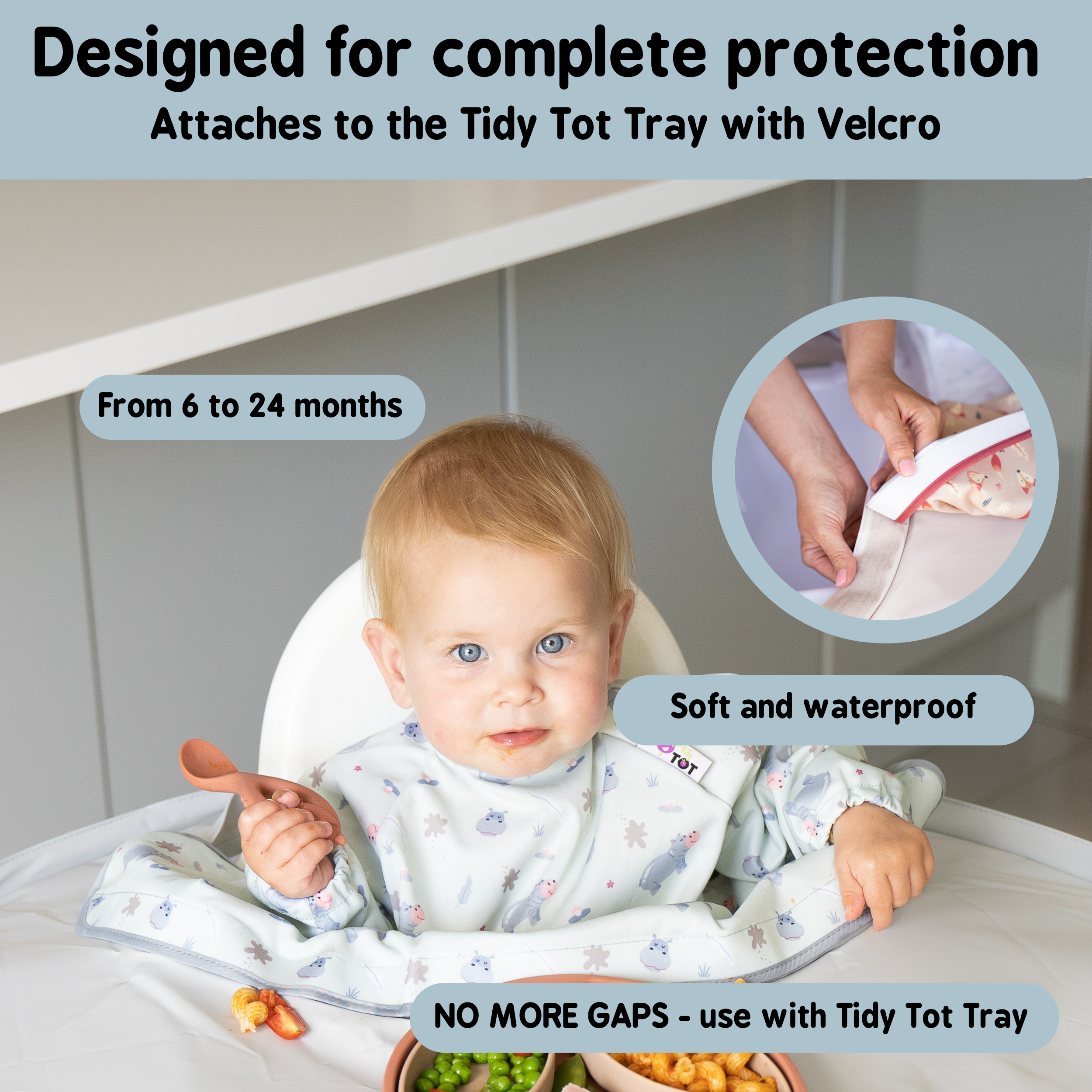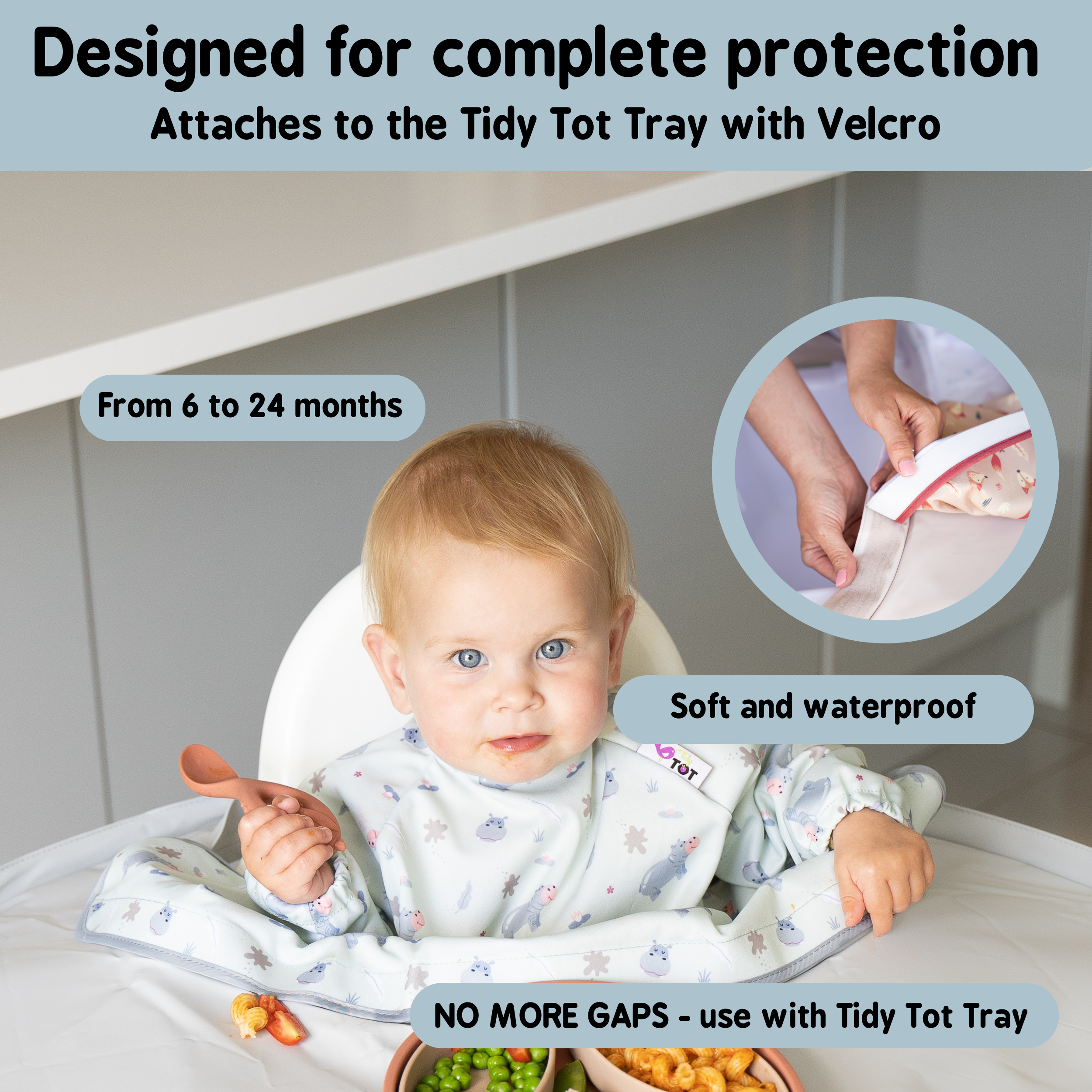 Available in a choice of beautifully stylish and fun prints, the Tidy Tot Coverall Bib for Kit offers full coverage from the mess and spills of weaning thanks to long sleeves and super-soft water resistant fabric. Perfect as an additional or spare bib to be used with theTidy Tot Bib & Tray Kit system. The adjustable neck fastening allows for a snug and comfortable fit for babies aged up to 2 years. Includes a removable wash strip to allow you to close the hook and loop fastening when machine washing or using without the Tidy Tot Tray to prevent snagging on other items.