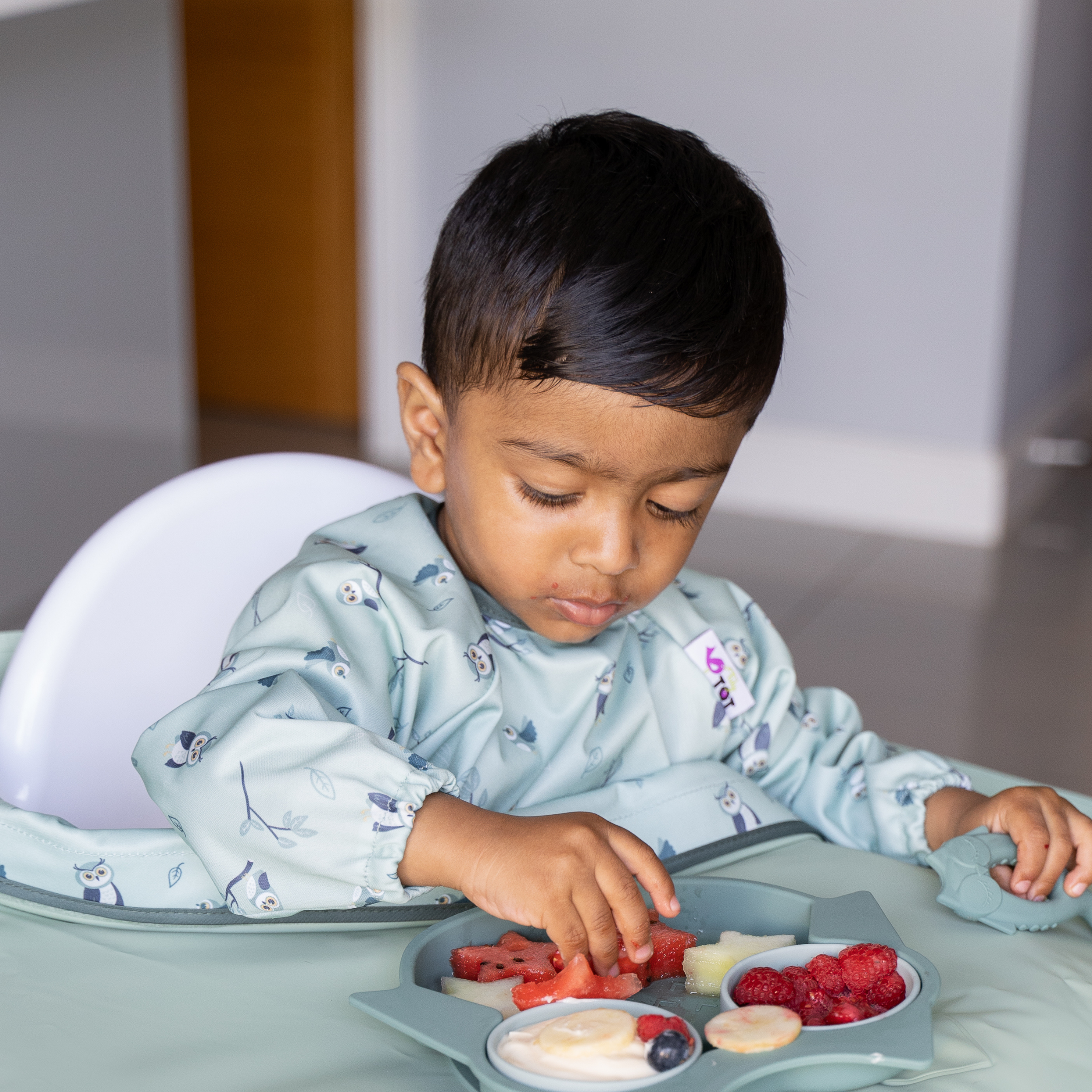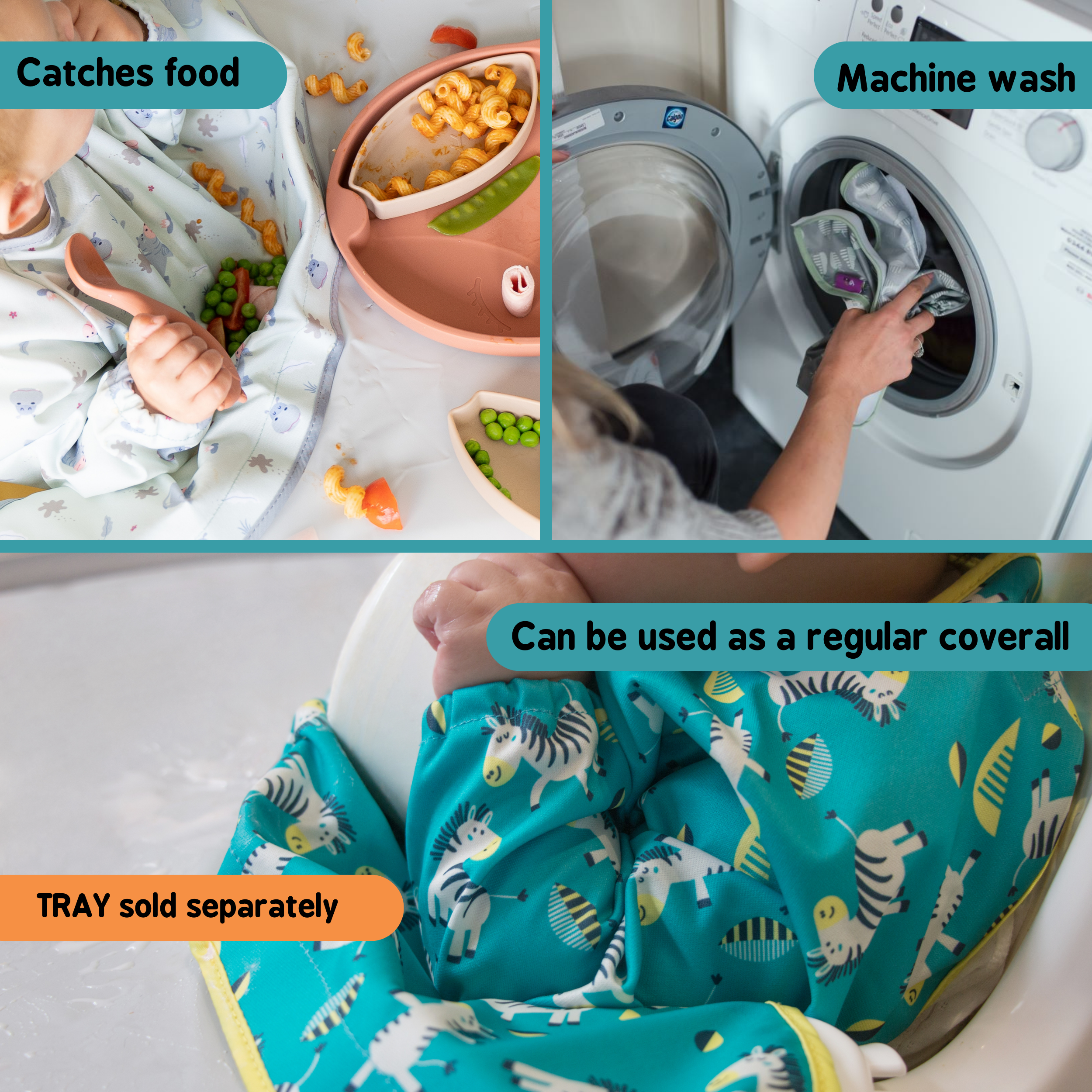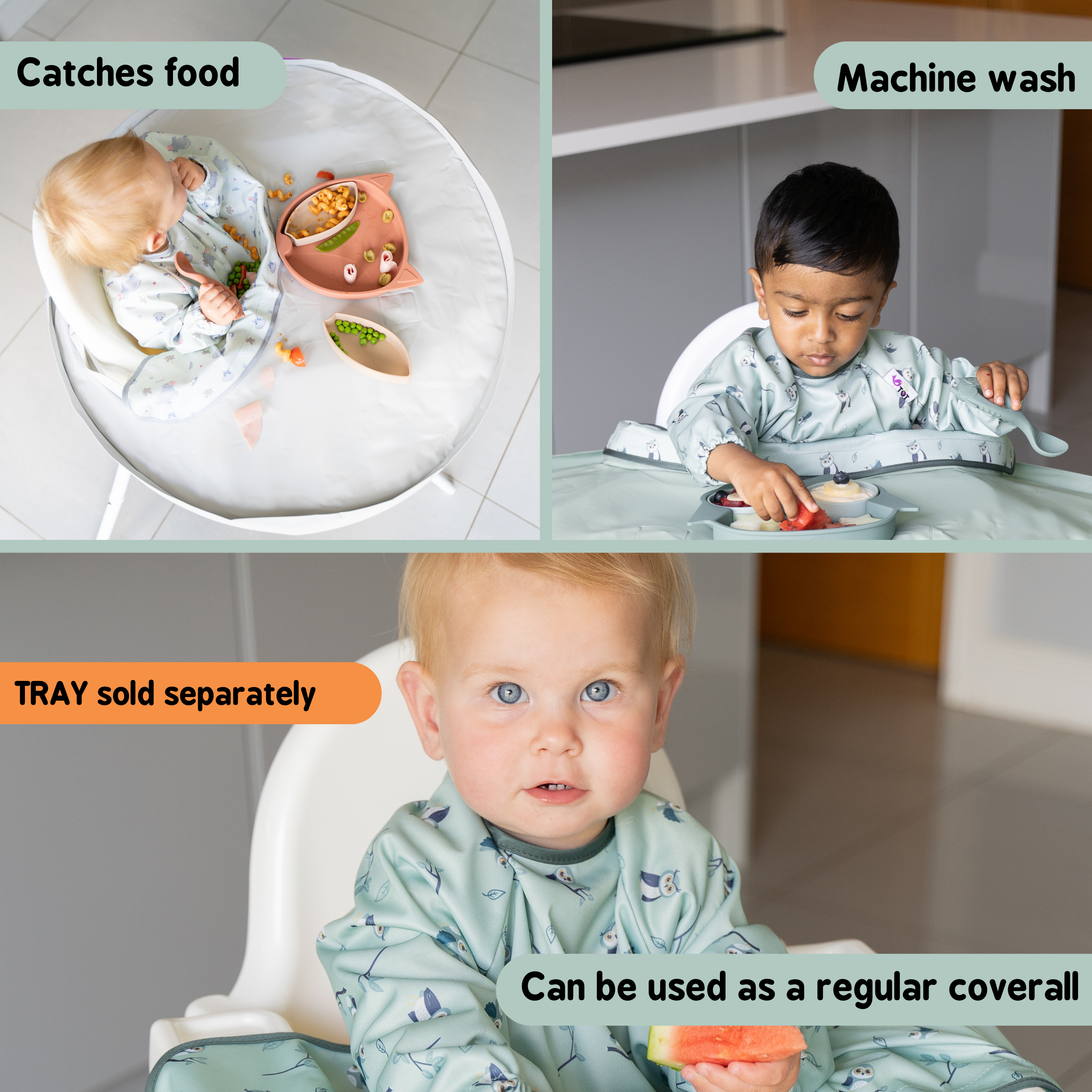 The full coverage design of the Tidy Tot Coverall Bib for Kit shields babies' garments from mealtimes and weaning mess. It's accessible in long or short sleeve styles. Ideal for each mealtime through-out the day to utilise your Tidy Tot Bib & Tray Kit system. Expertly crafted from soft, water-resistant fabric, these convenient bibs are machine washable or easily wiped clean.
