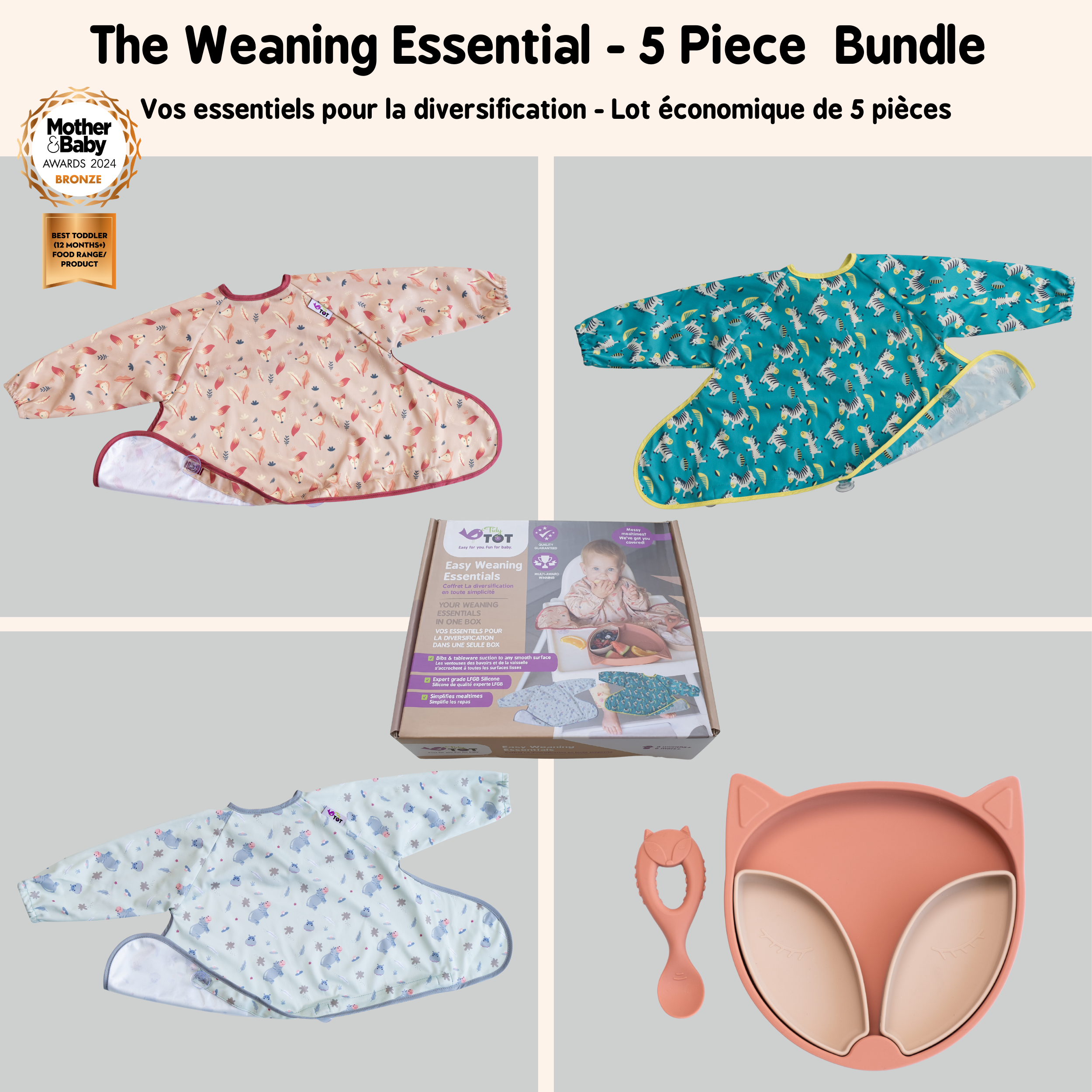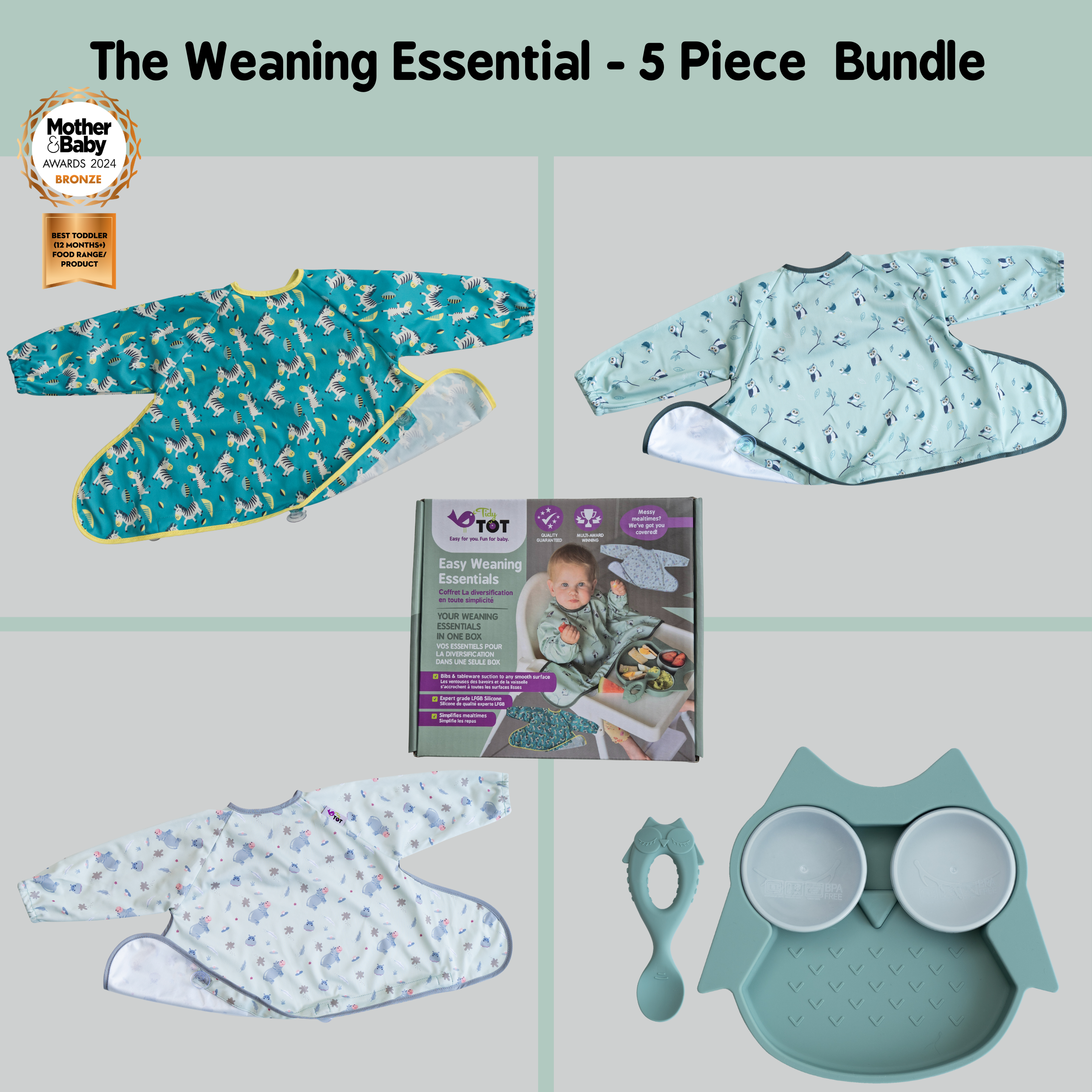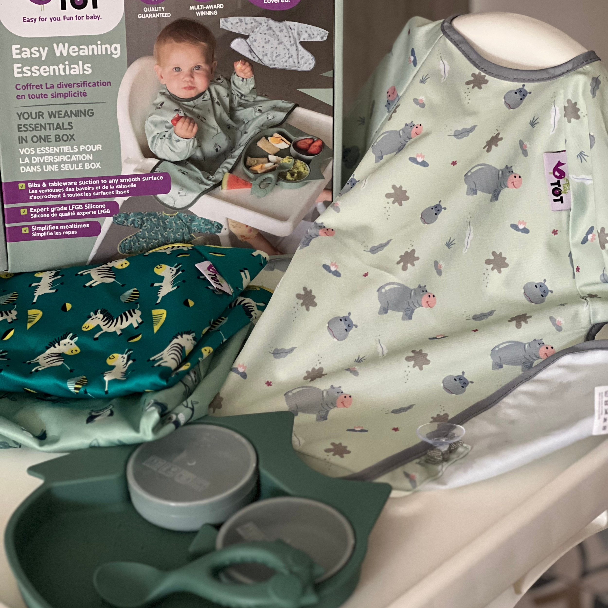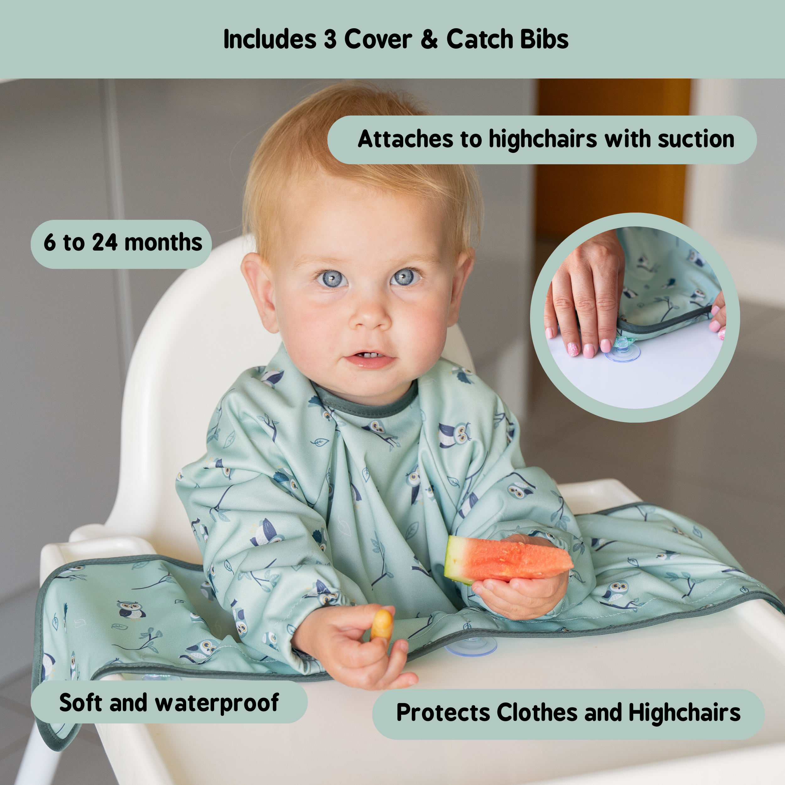 This quick and easy to use weaning bib, with its unique design sticks to highchairs, highchair trays and smooth surfaces to ‘catch’ dropped food and spills. These amazing Cover & Catch bibs also offer full coverage, long-sleeves and water-resistant fabric to protect baby’s clothes and make clean-up time so much quicker!