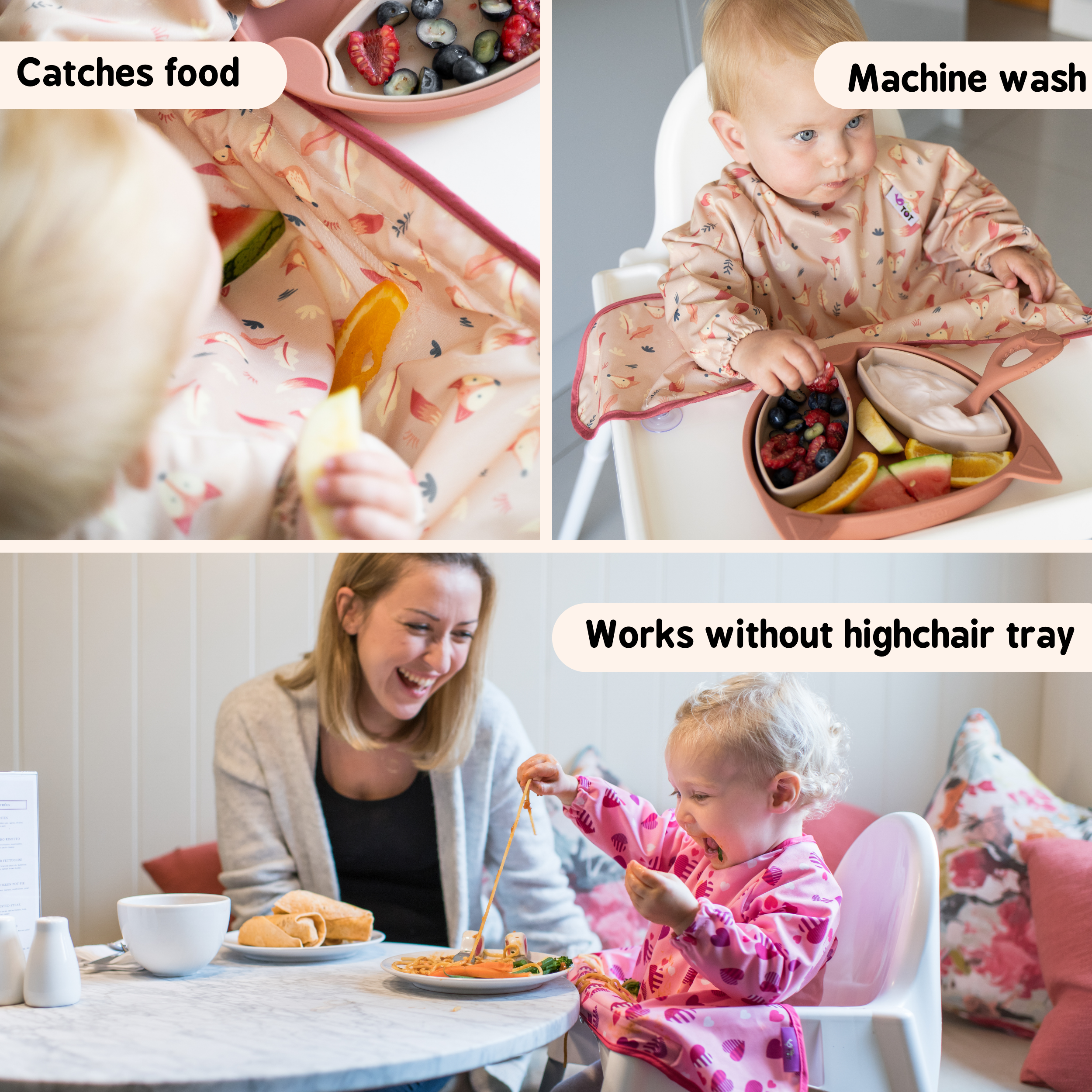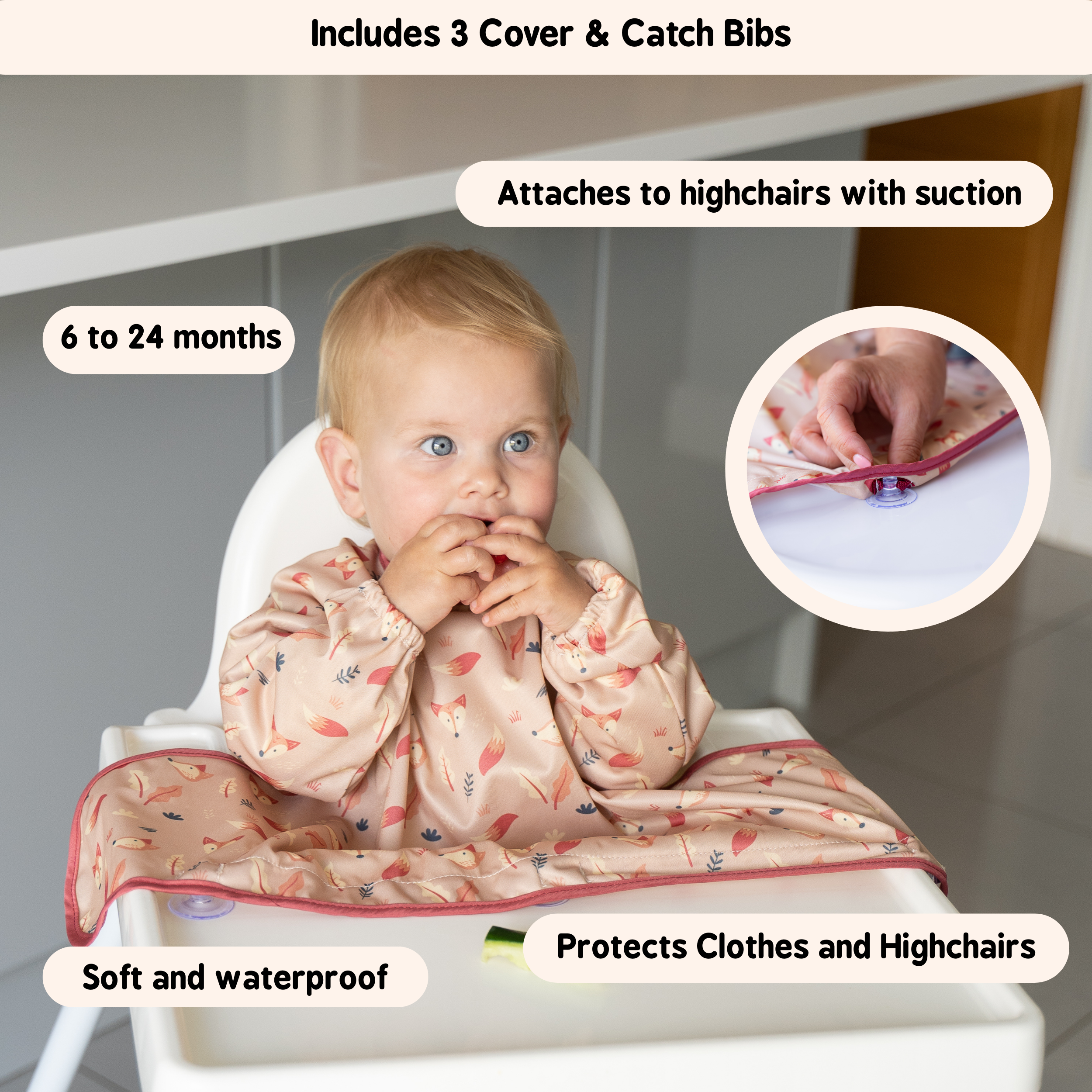 Our Cover & Catch All Bibs couldn’t be easier to use, just simply stick the suction pads onto the highchair, tray or smooth table surfaces and let your baby go wild with whatever they want to do, be this eat, drink or play! (Please note that suction cups will not stick optimally to rough or textured surfaces such as wood, including the Stokke Tripp Trapp high chair.)