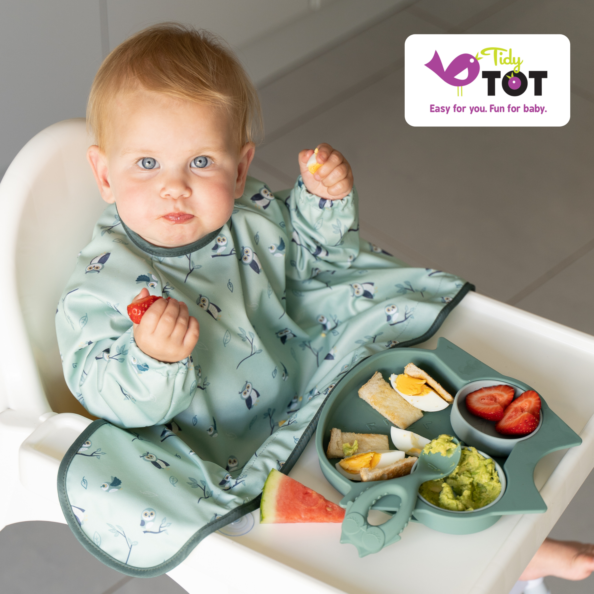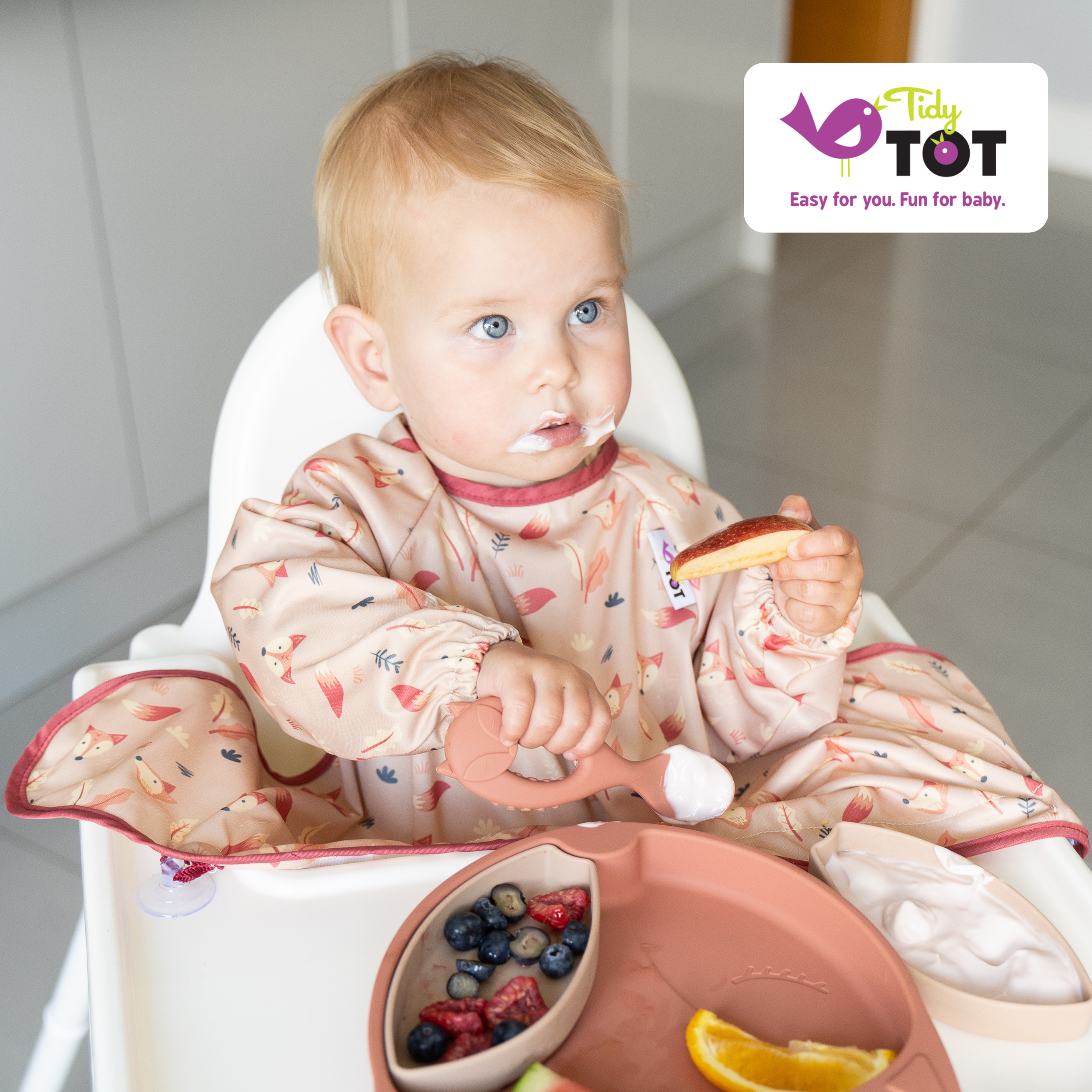 The award-winning weaning bib innovation from Tidy Tot, this clever coverall bib attaches to smooth surfaces to catch dropped food and spills. Simply attach the suction cups to your highchair, highchair tray or smooth table surface – it’s so quick and easy to use! (Please note that suction cups will not stick optimally to rough or textured surfaces such as wood, including the Stokke Tripp Trapp high chair). With long sleeves for full protection, an adjustable neck fastening and super-soft, water resistant fabric, this bib offers complete protection for clothes and highchair seats from the mess and spills of weaning. Knowing baby’s clothes are fully protected means they can be left to focus on the important skills needed to practice independent self-feeding – without all the mess and stress!