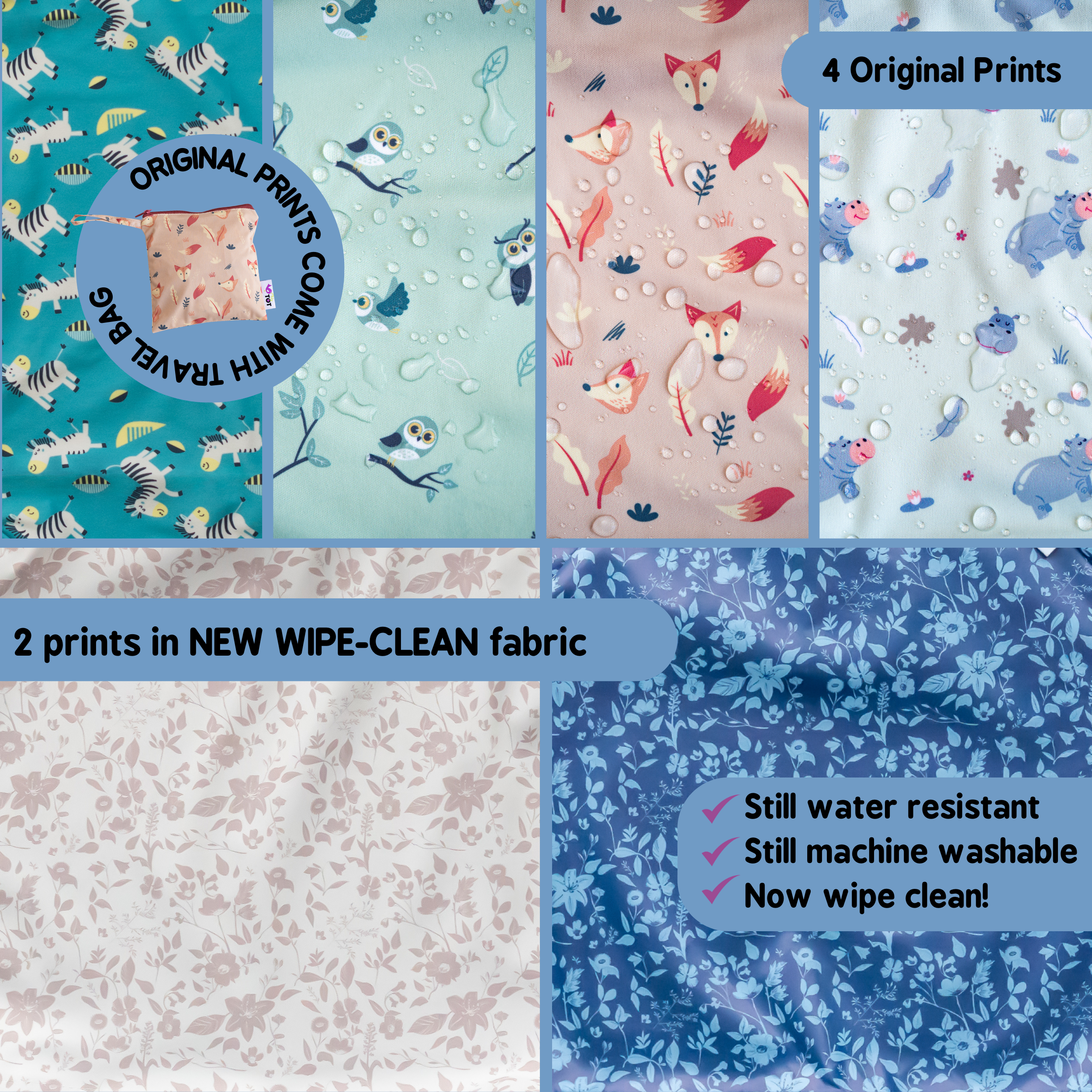 This collection is the introduction of our new wipe-clean fabric. Still beautifully soft and machine washable, but even quicker to clean up after messy mealtimes.