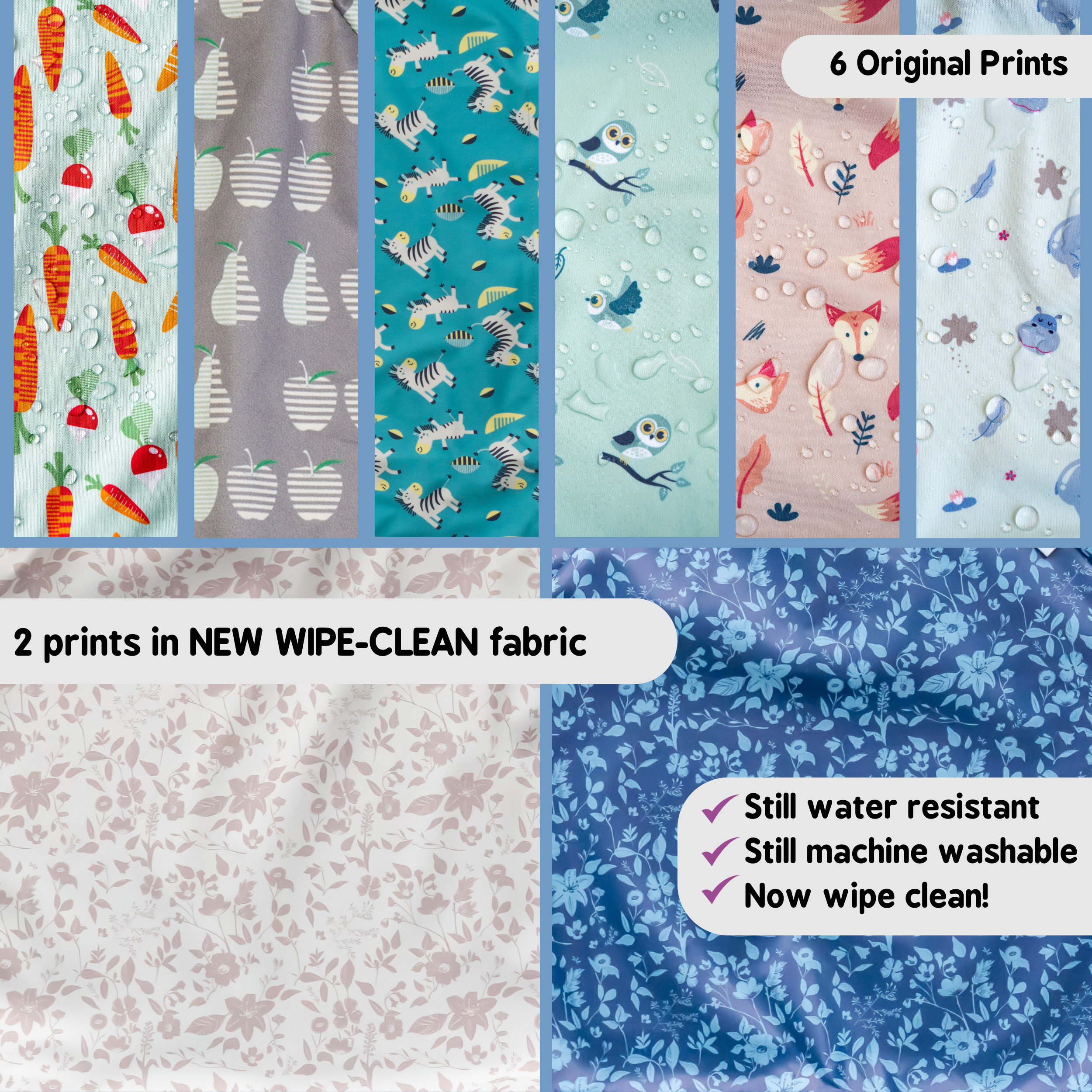 Our Coverall Bibs for Kit are now available in 2 types of fabric – baby soft or wipe clean. The Fleur de Jardin collection is designed for practicality, convenience and style - so all of the bibs in this collection are made with our NEW wipe clean fabric.