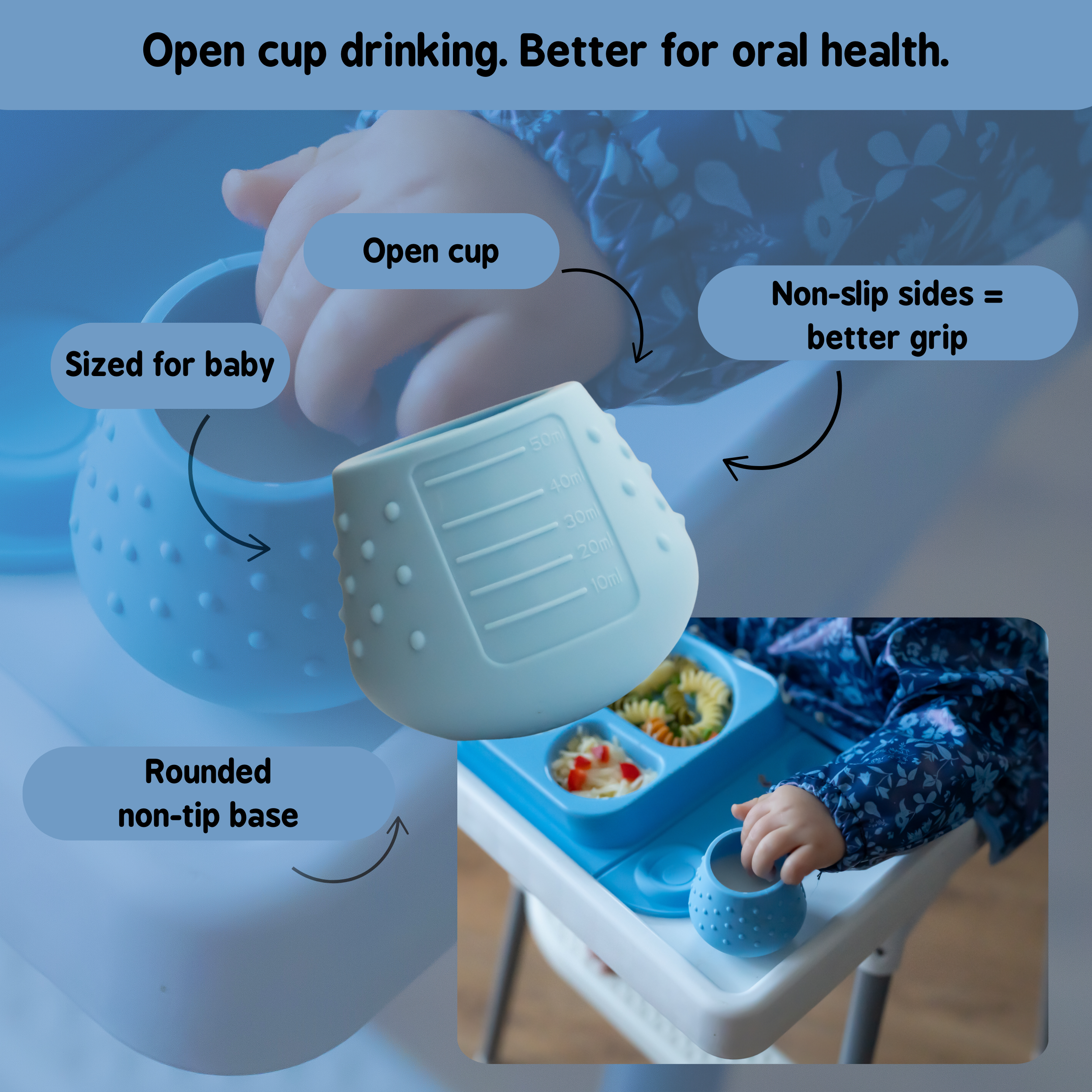 Designed to support babies from their very first sips. Dentist and expert approved, open cup drinking helps babies learn to sip (not suck), supporting strong oral motor development and healthy teeth and gums.