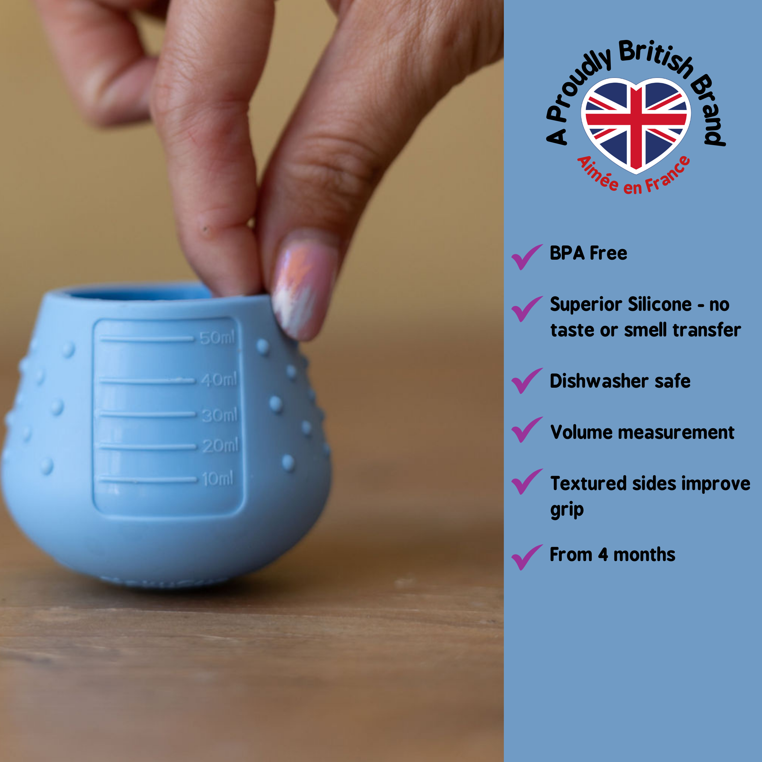 The Dinky Cup, like all our silicone products, is made from our premium LFGB-grade silicone. This means it won't transfer odours or tastes and is made from food-grade silicone that is free from BPA, phthalates and PVC.