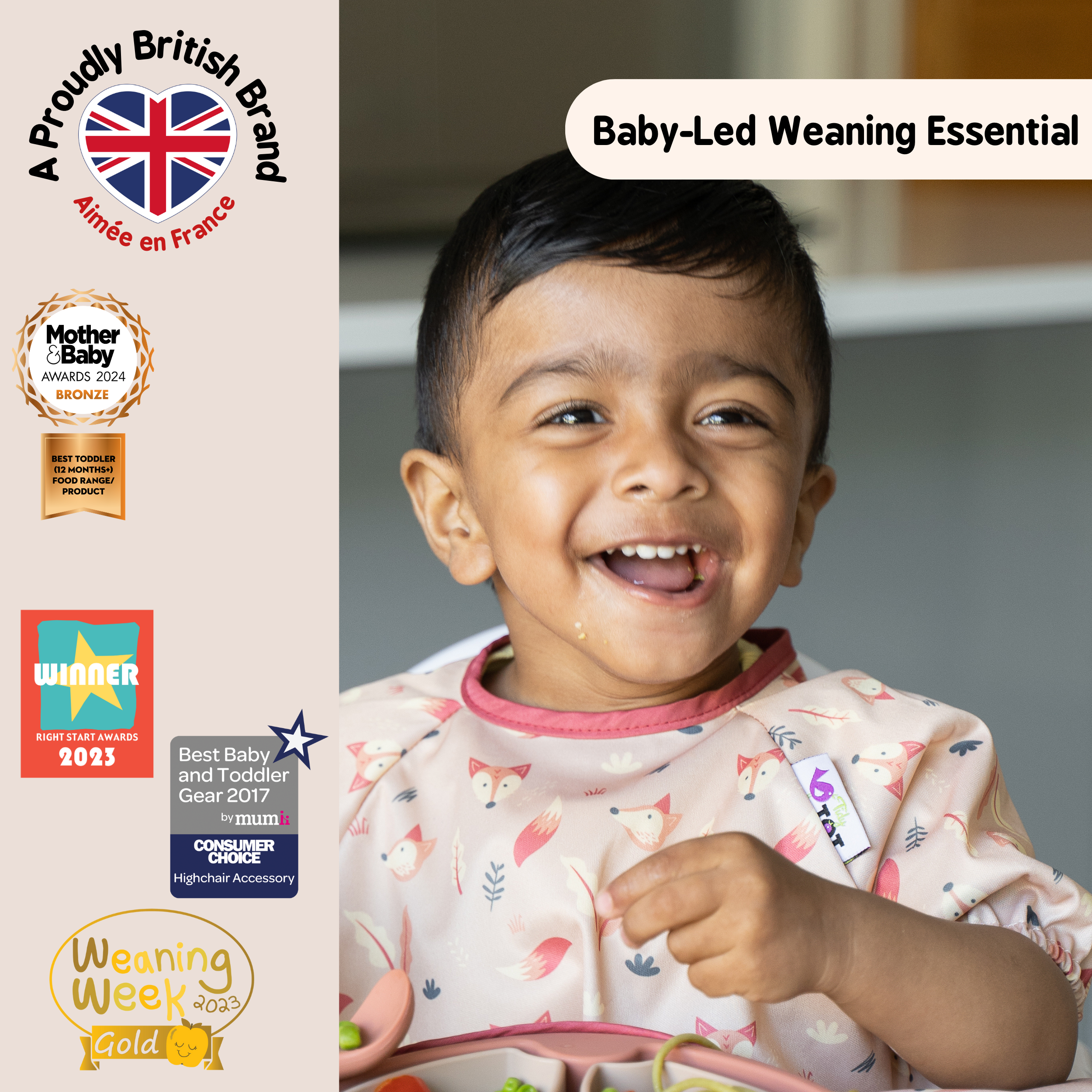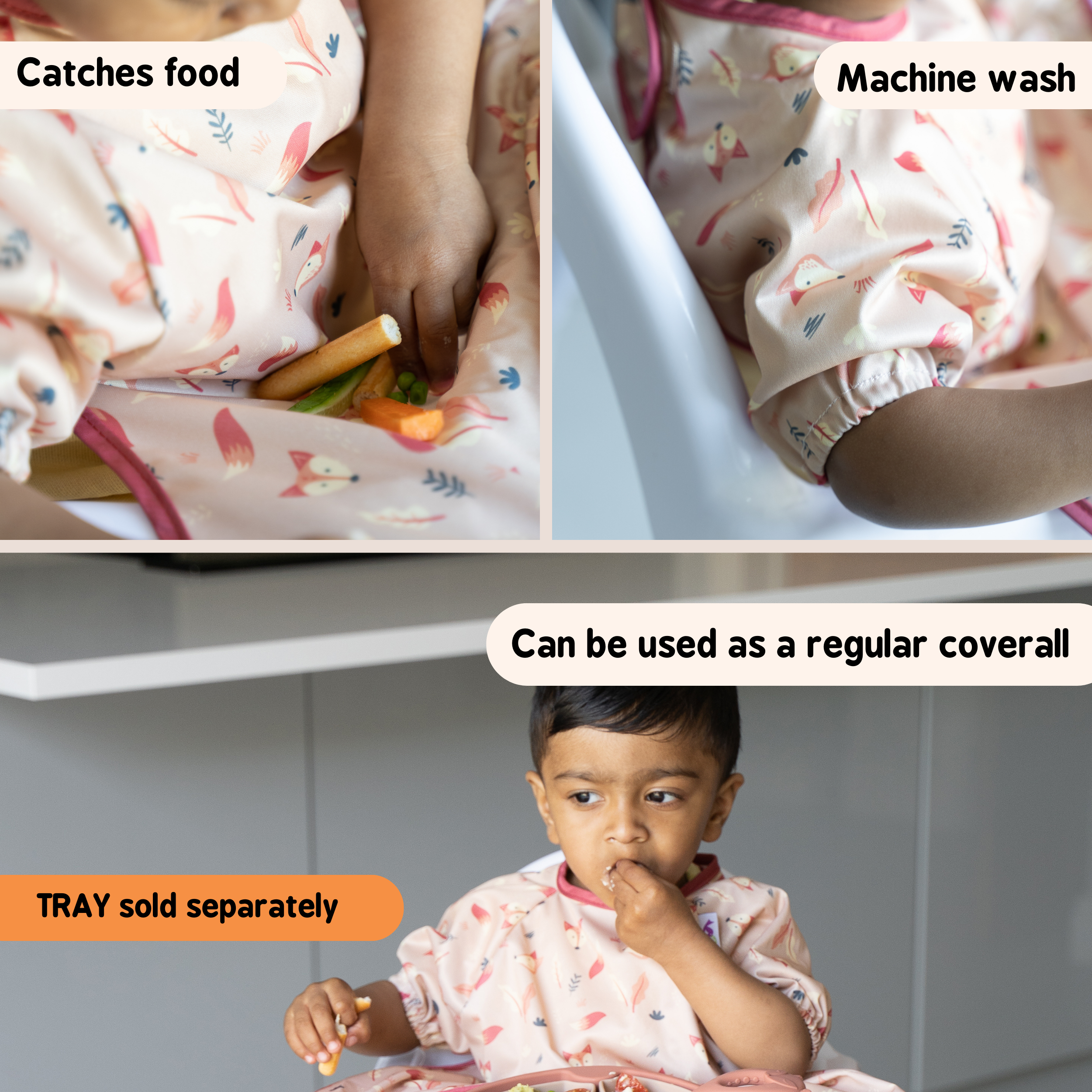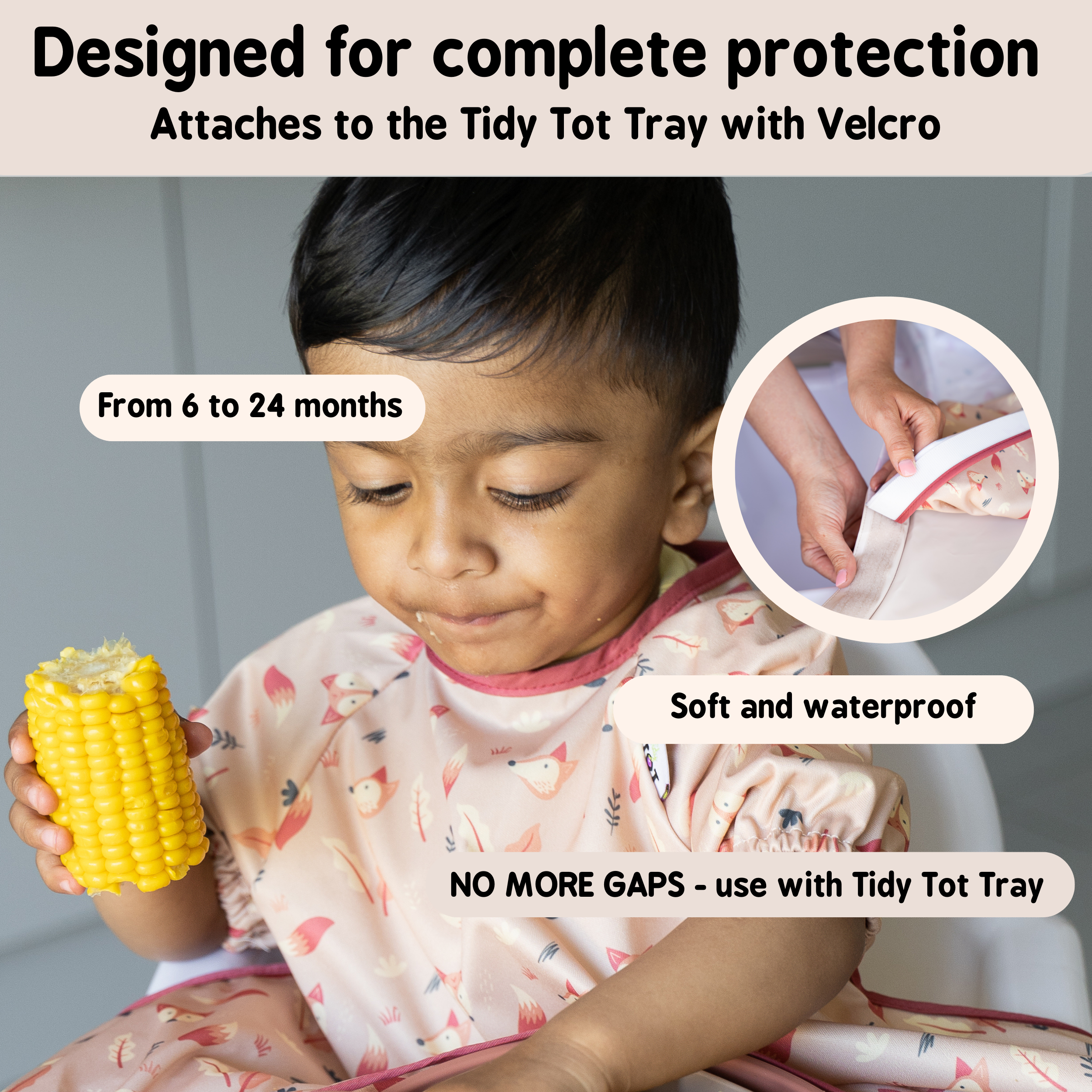 Available in a choice of beautifully stylish and fun prints, the Tidy Tot Coverall Bib for Kit offers full coverage from the mess and spills of weaning thanks to long sleeves and super-soft water resistant fabric. Perfect as an additional or spare bib to be used with theTidy Tot Bib & Tray Kit system. The adjustable neck fastening allows for a snug and comfortable fit for babies aged up to 2 years. Includes a removable wash strip to allow you to close the hook and loop fastening when machine washing or using without the Tidy Tot Tray to prevent snagging on other items.