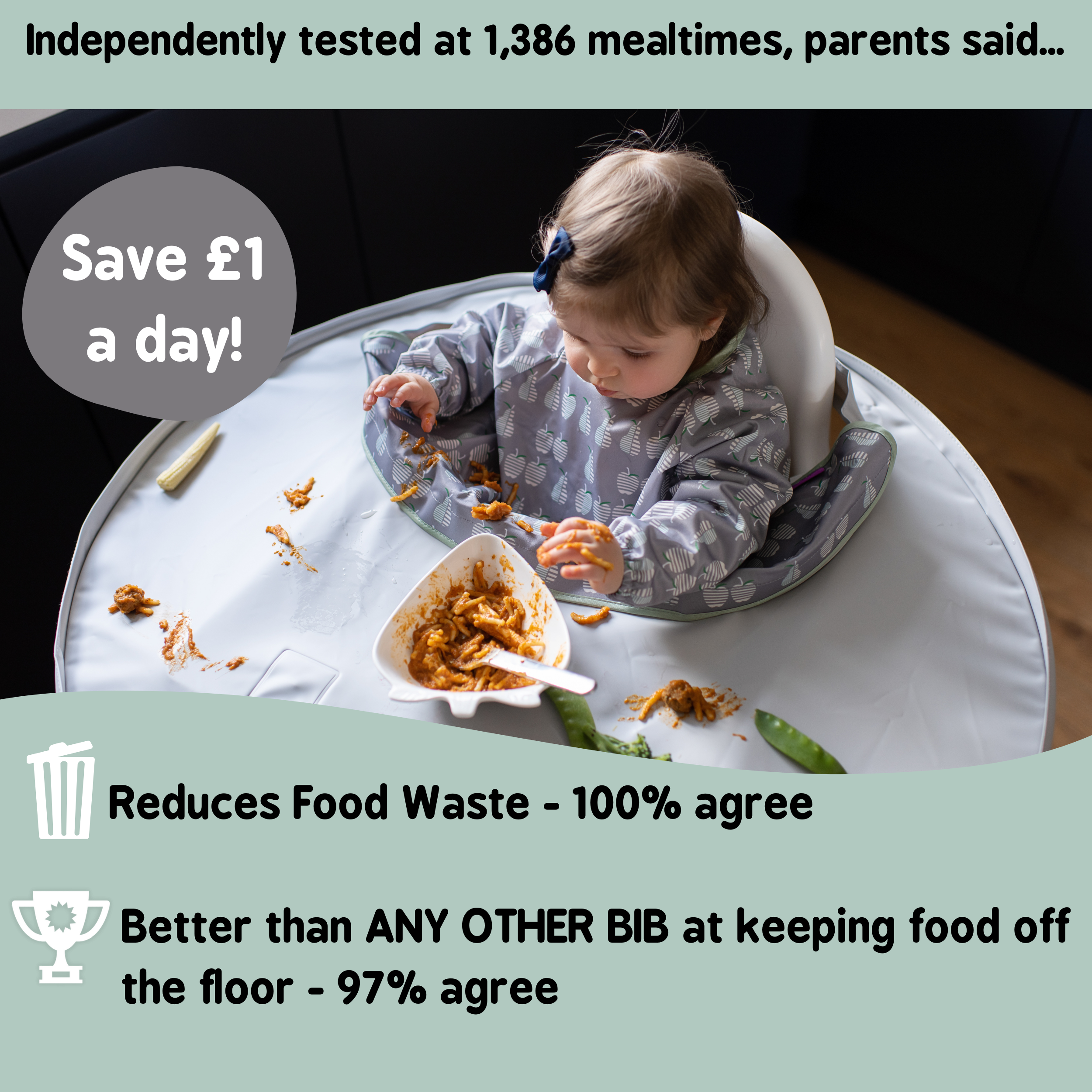 Saves 10 minutes clean-up EVERY mealtime, reduces food waste by a massive 95% and proven to save over £1 a day in wasted food!*