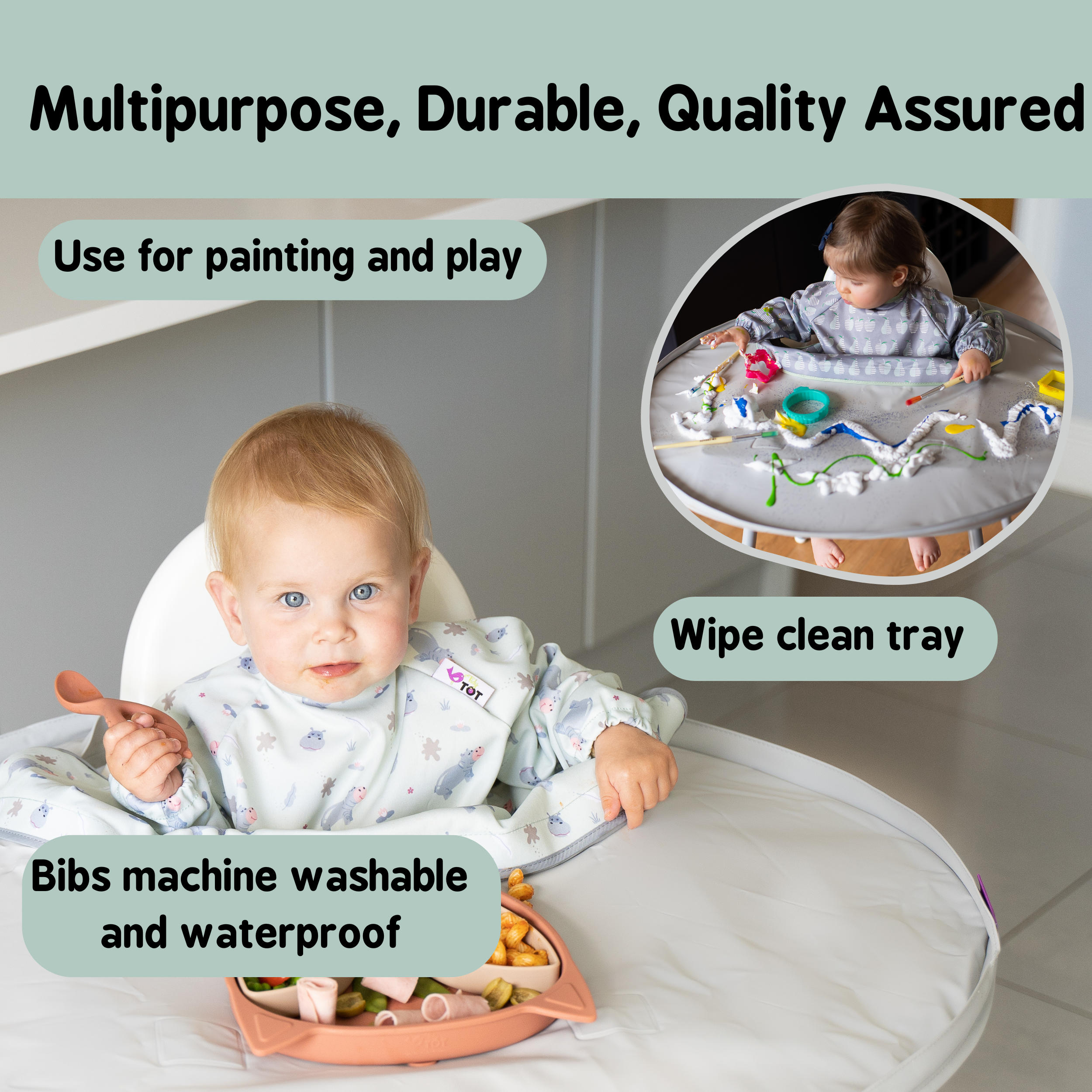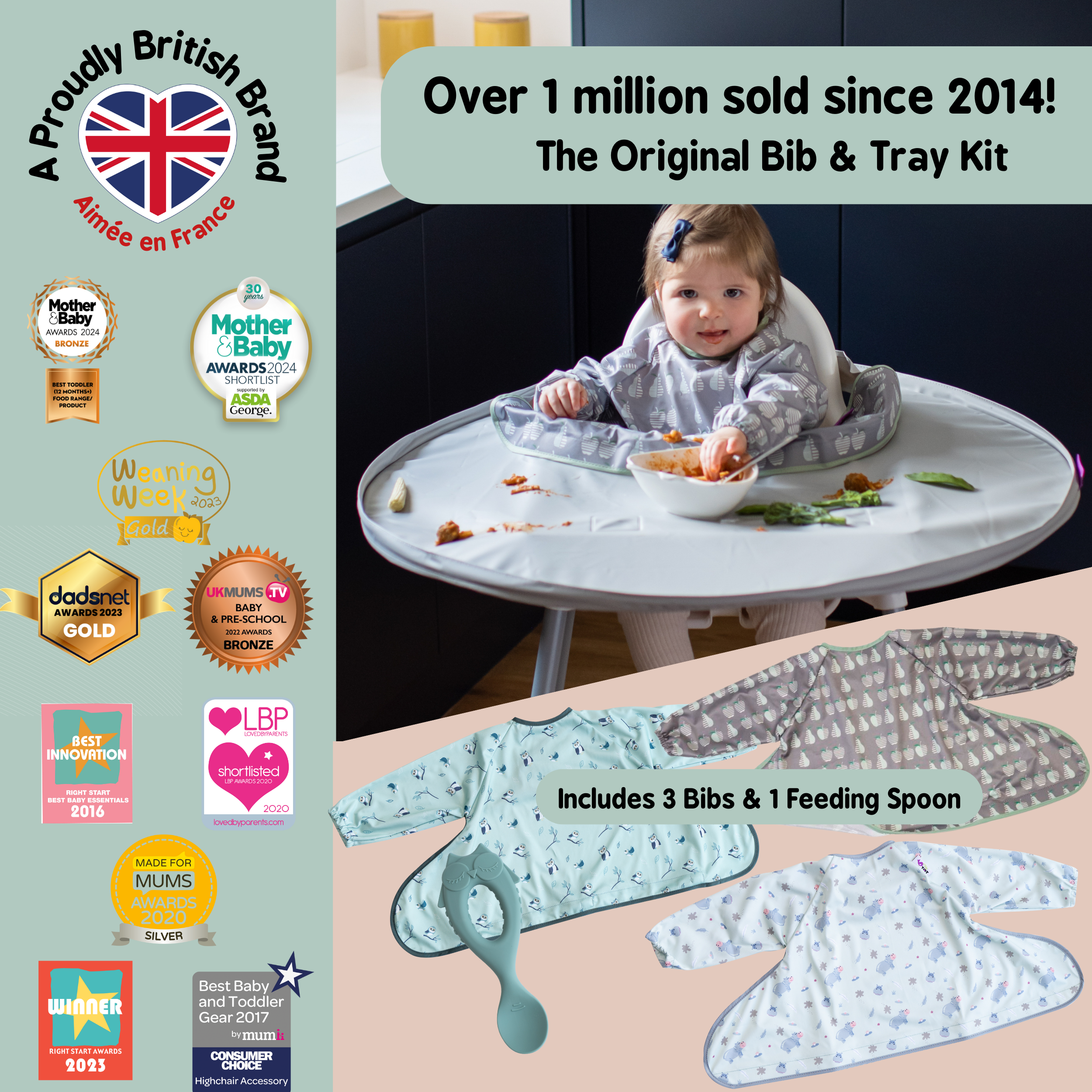The multi award-winning Bib & Tray Kit completely protects your baby whilst weaning, as well as keeping your highchair and floor free from food mess and spills.