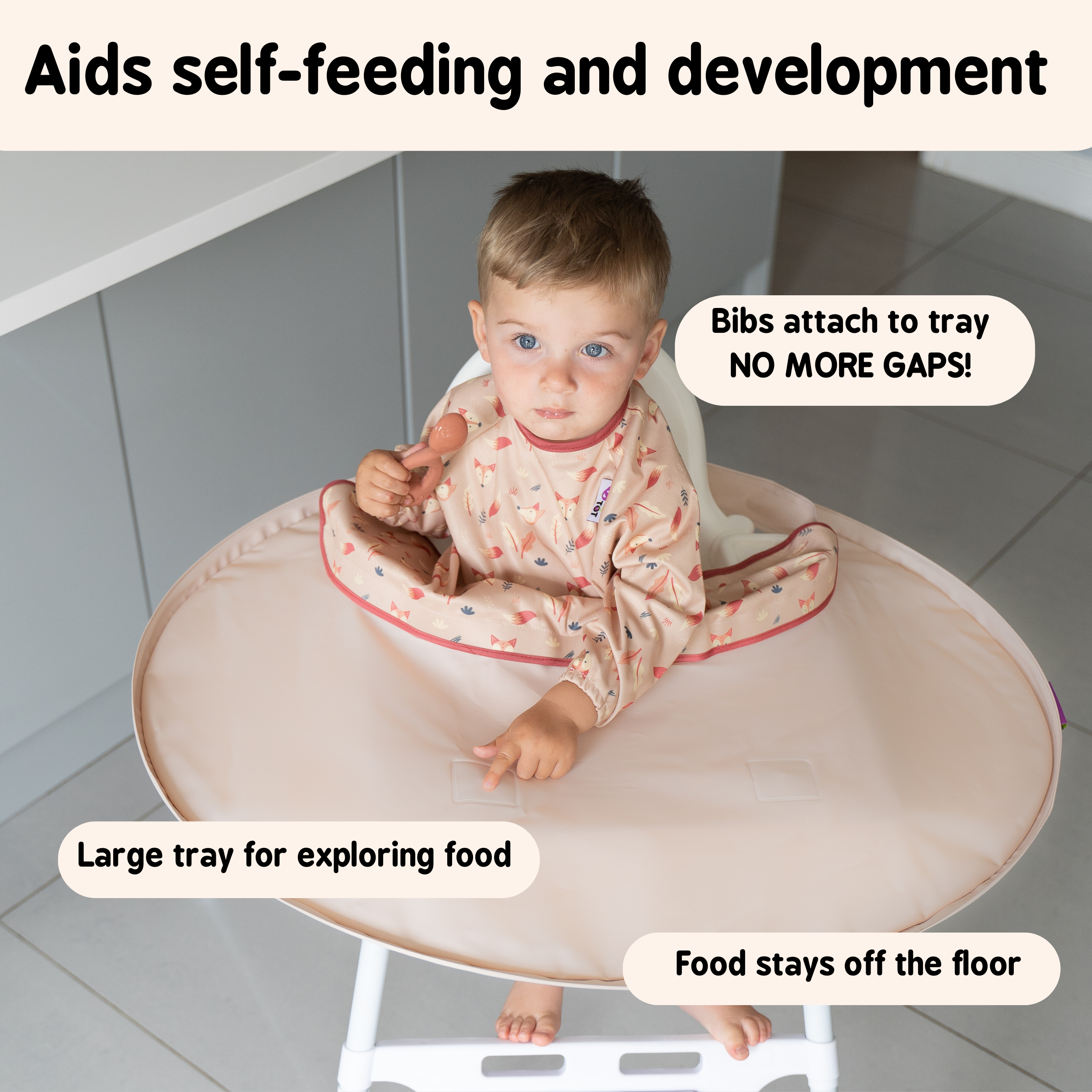 The coverall bibs included in pack attach to the tray to close any gaps between baby and their highchair tray, preventing food from falling onto their lap and clothes.
