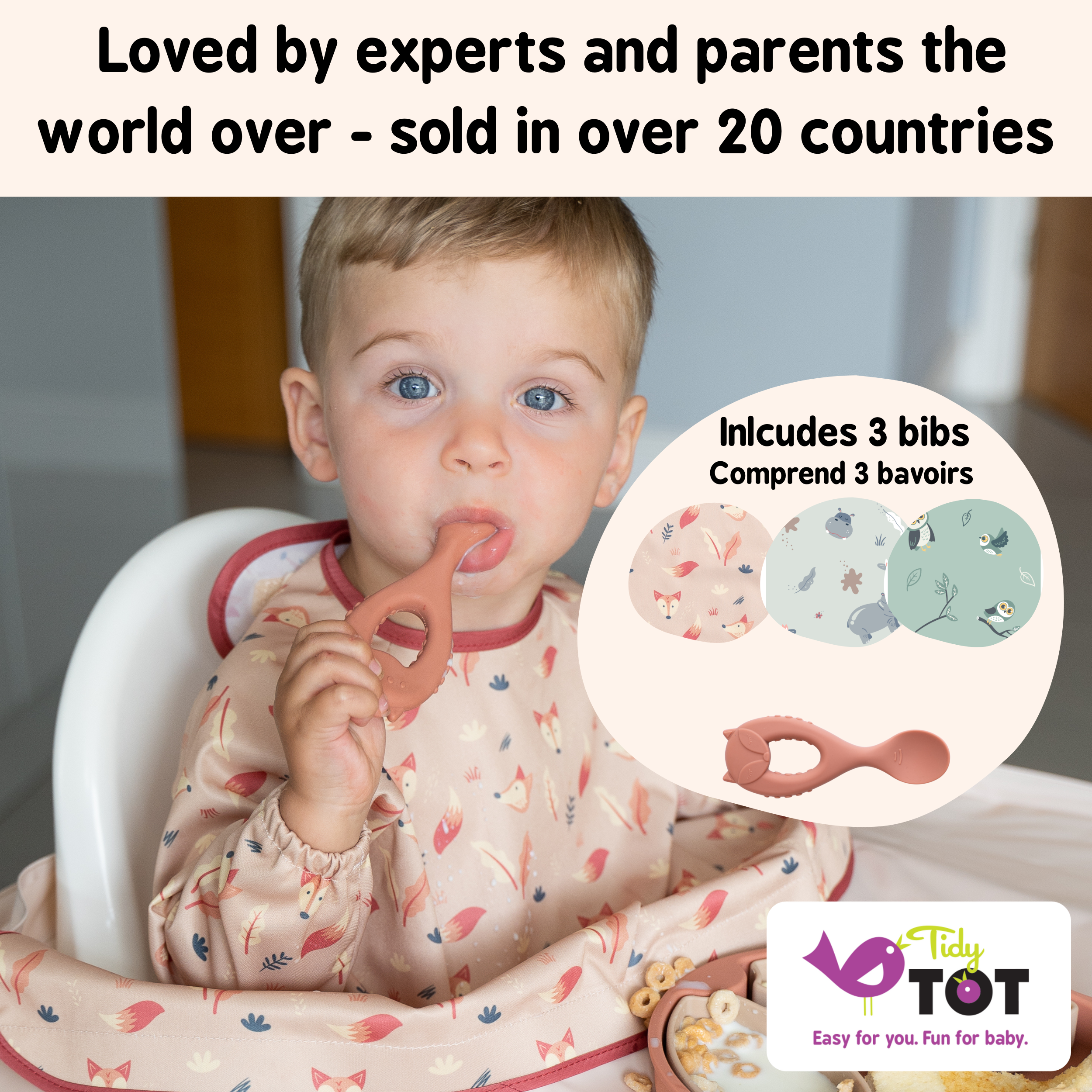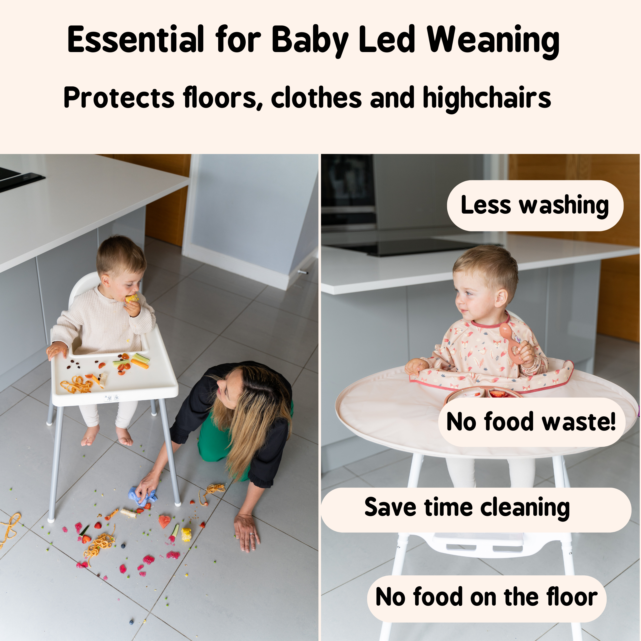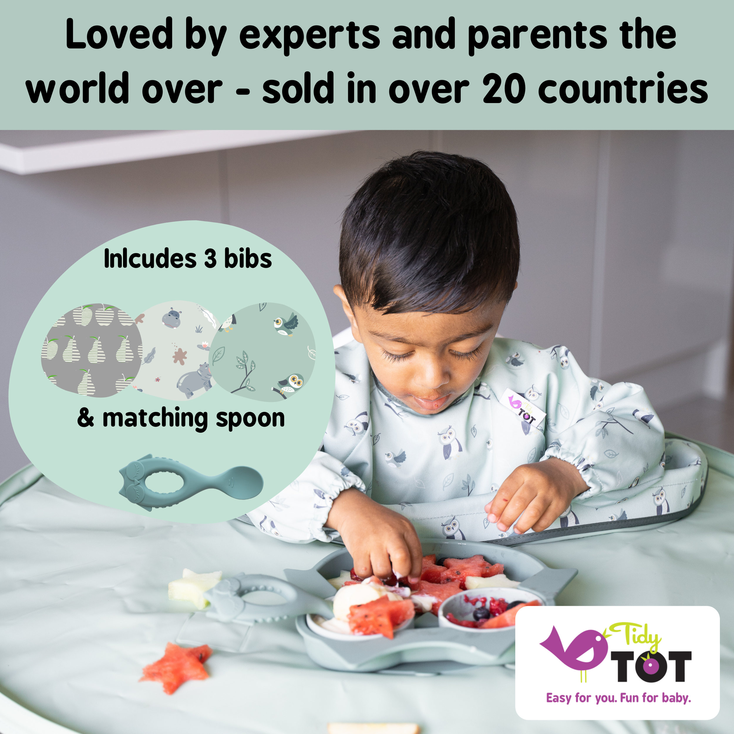 * Based on 1,386 mealtimes with weaning babies, Feb,22. 9 out of 10 parents following Baby Led Weaning prefer to wean using the Tidy Tot Bib & Tray Kit than without it; 79% estimate the Bib & Tray Kit saves 10 minutes or more cleaning up every meal; 64% said using the Bib & Tray Kit saved over £1 per day in food waste
