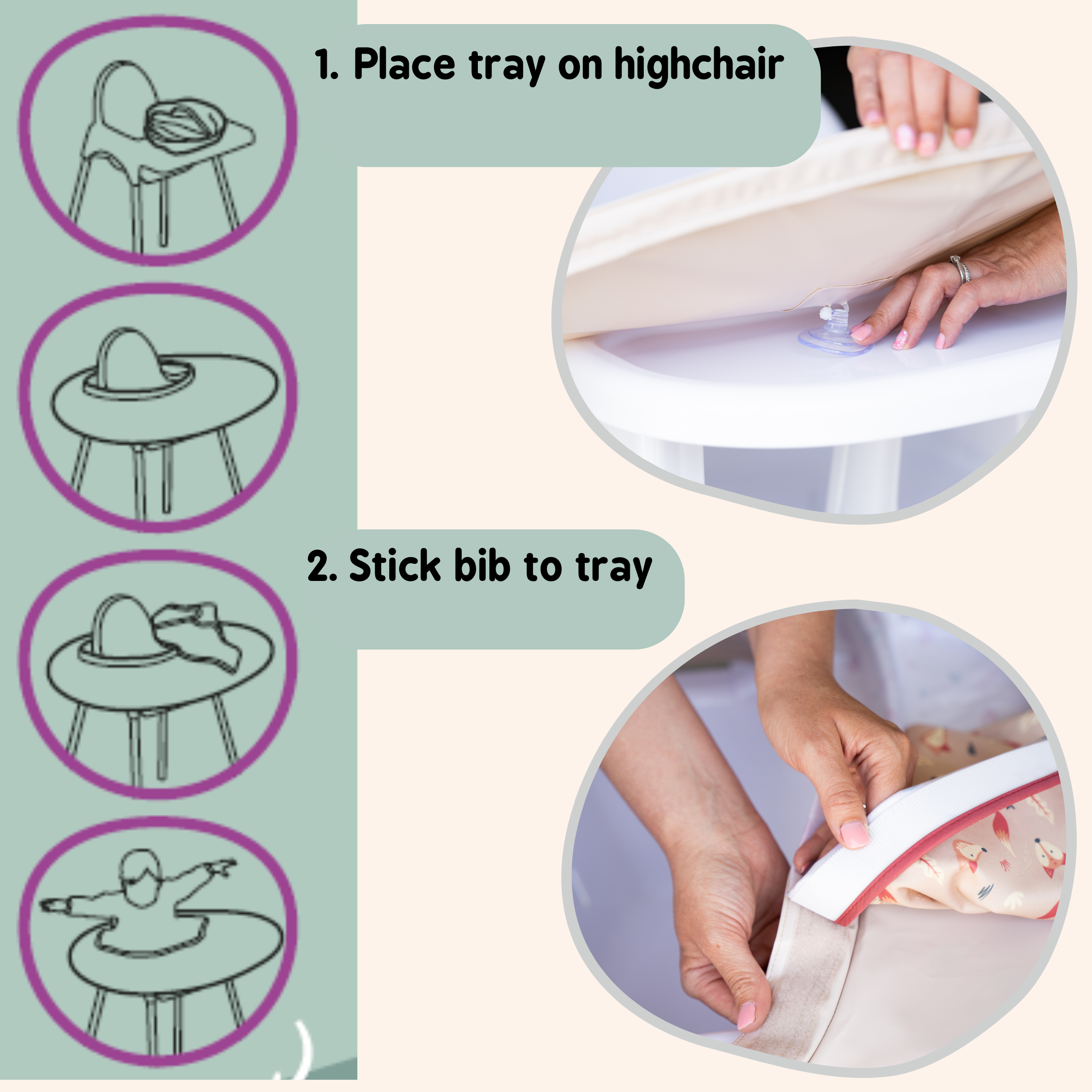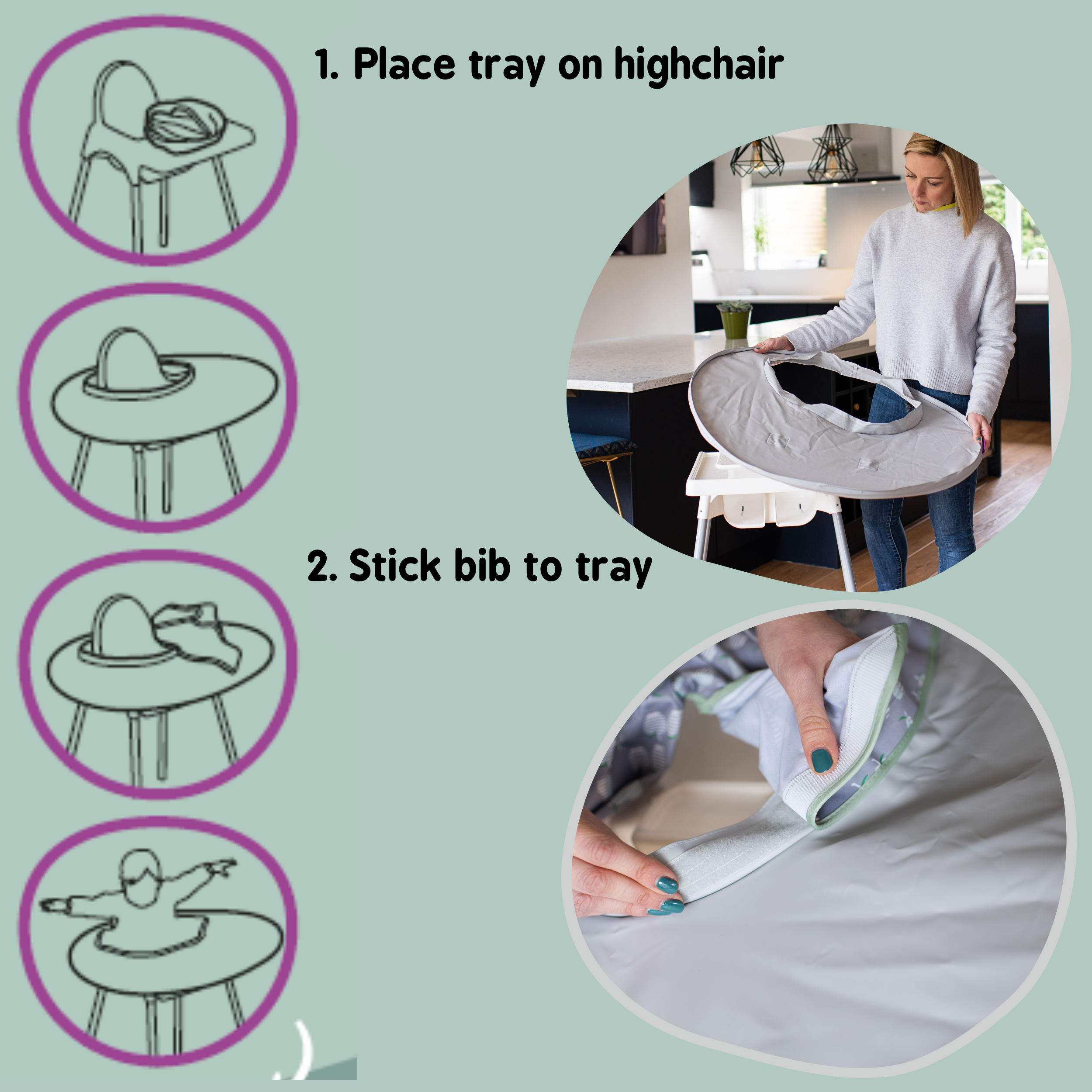 We have created this handy video to show you how to set up to the Bib & Tray Kit. Not sure how to fold your Bib & Tray Kit?Click here to see how. Let baby enjoy and explore their food whilst you can relax about the amount of mess they are making!